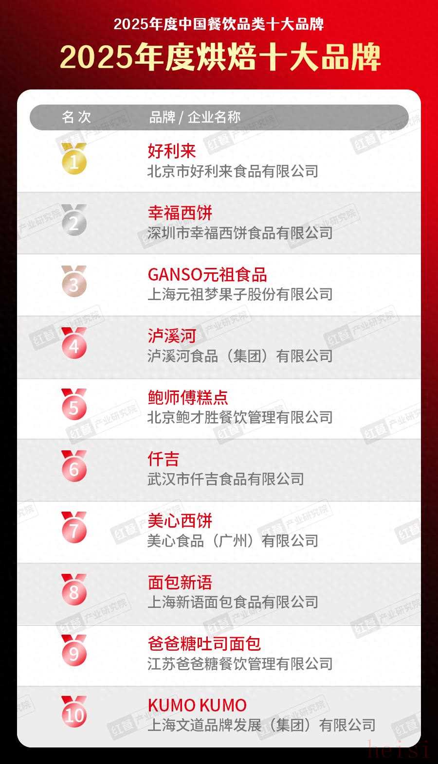 2025年3月12日,“2025中國餐飲品類十大品牌”(第七屆中國餐飲品類紅鯉獎(jiǎng))頒獎(jiǎng)盛典在成都隆重舉行,30個(gè)餐飲賽道的300個(gè)品牌榮耀登榜。當(dāng)天,“2025年度中國烘焙十大品牌”榜單重磅揭曉,好利來、幸福西餅、GANSO元祖食品、瀘溪河、鮑師傅糕點(diǎn)、仟吉、美心西餅、面包新語、爸爸糖吐司面包、KUMO KUMO十個(gè)品牌強(qiáng)勢上榜。
