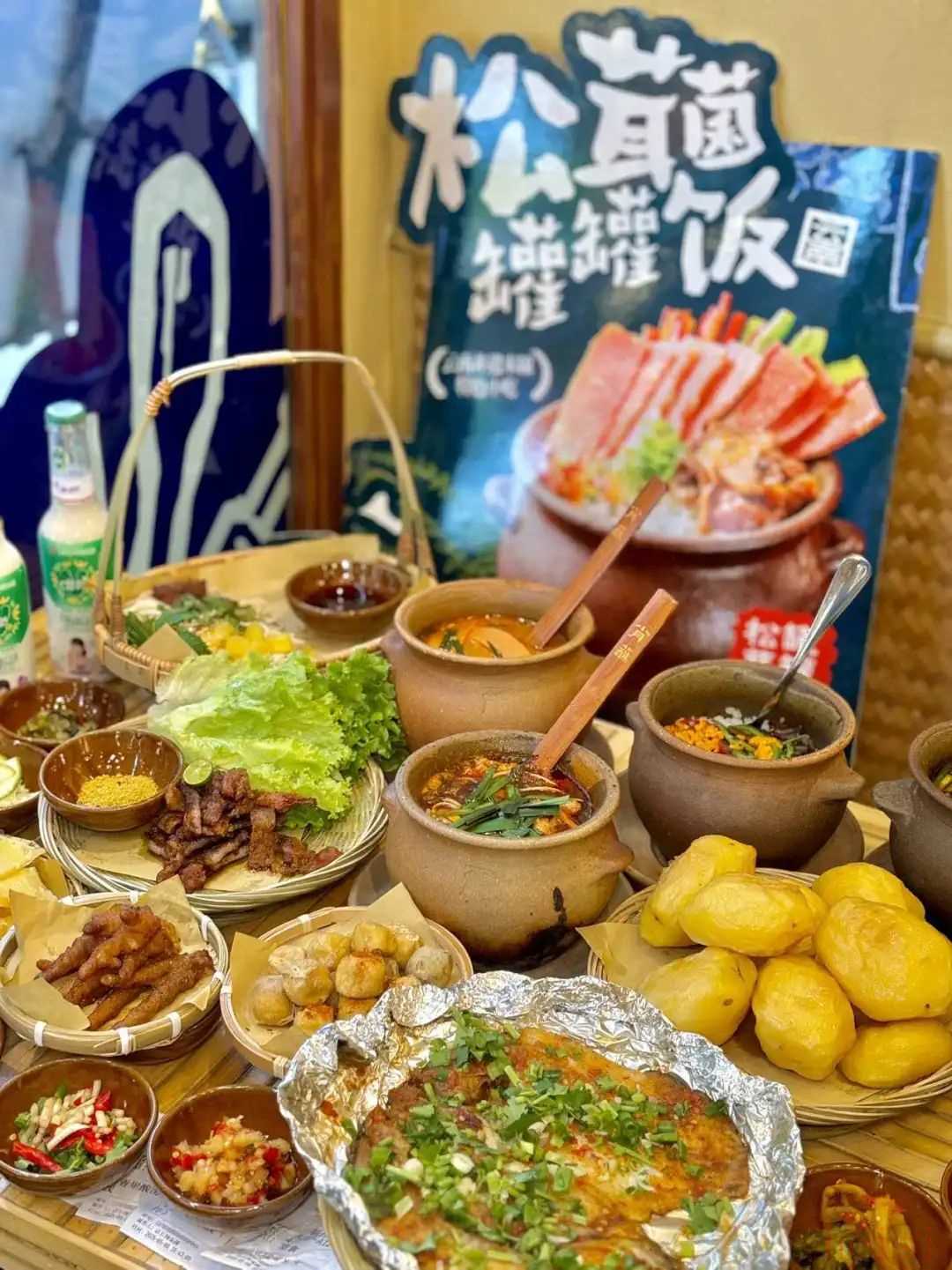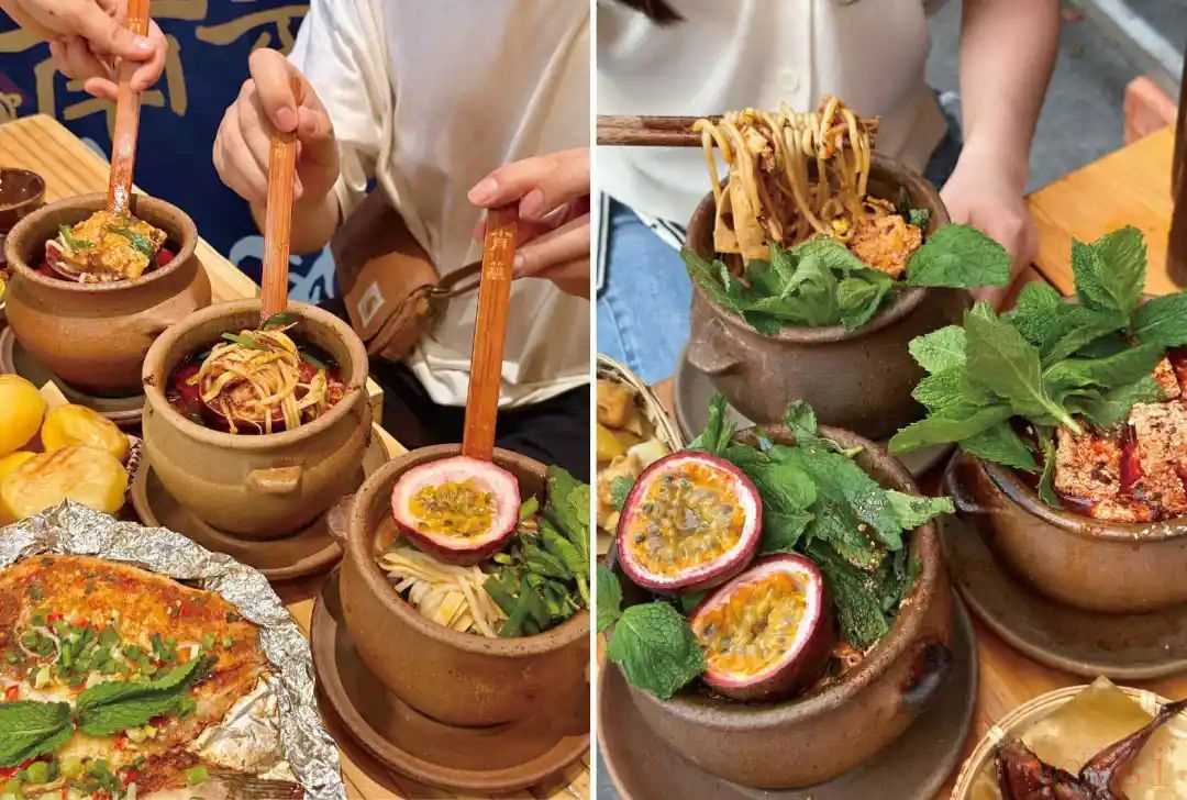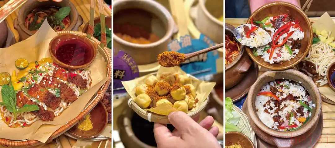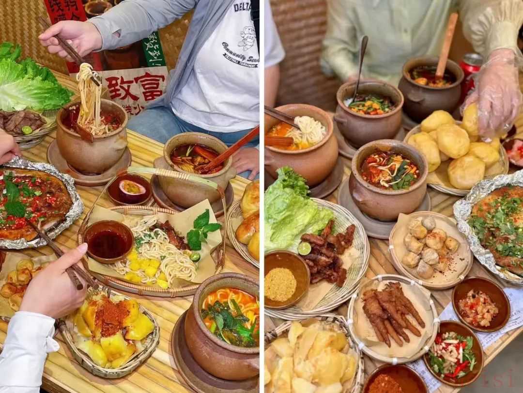 ◎圖源:肖蘸罐罐米線相比早期小門店,新店在空間、動線、品類結(jié)構(gòu)上全面升級:保留罐罐米線核心產(chǎn)品的同時,融入邊境小烤等云南街邊元素,并通過民族扎染、陶罐裝飾、街巷煙火氛圍等軟裝設(shè)計,將“云南街頭民風(fēng)”具象化呈現(xiàn)。