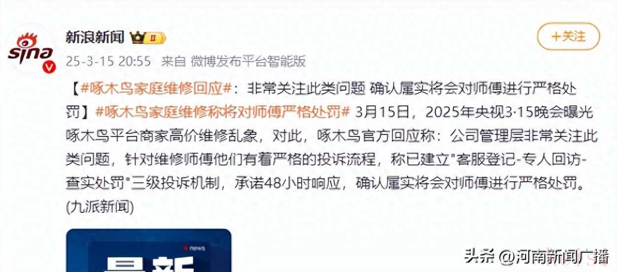 今年央視3·15晚會,曝光了國內最大家電維修平臺——啄木鳥家庭維修,迫使維修師傅以虛報故障、抬高價格、配件以次充好等坑騙消費者。