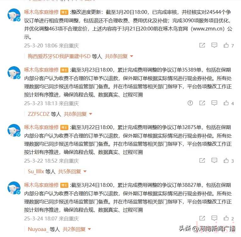 然而,僅發(fā)布了兩條印有公章的整改聲明后,后續(xù)進展就只在3月17日微博的留言中模板化更新了,3月21日至24日的留言只有處理爭議訂單數(shù)量的變動,“多位網友吐槽啄木鳥整改敷衍”的話題也登上熱搜。