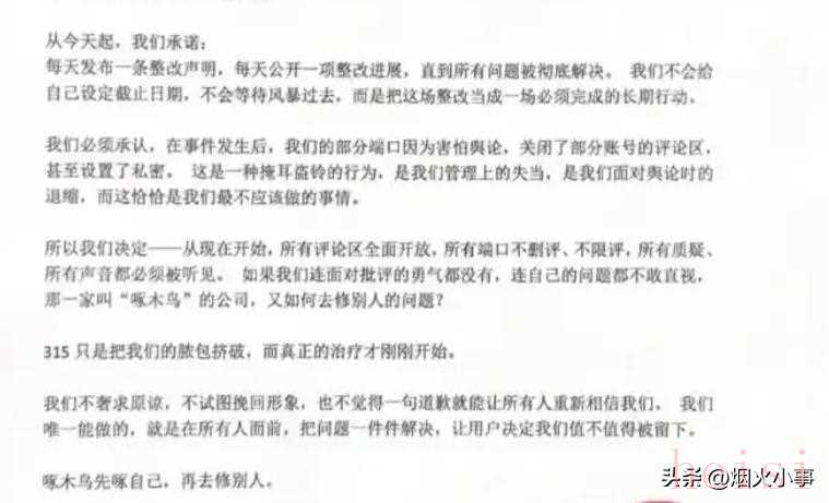 在第二次聲明中,啄木鳥官方明確表示,公司將不再推卸責(zé)任,而是徹底改正錯誤,徹底面對問題。