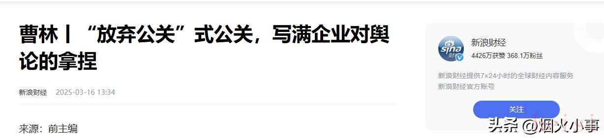 2、曹林丨“放棄公關(guān)”式公關(guān),寫滿企業(yè)對輿論的拿捏 新浪財經(jīng) 2025年3月16日發(fā)布