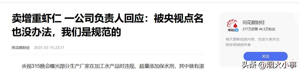 1、賣增重蝦仁 一公司負(fù)責(zé)人回應(yīng):被央視點名也沒辦法,我們是規(guī)范的 同花順財經(jīng) 2025年3月15日發(fā)布