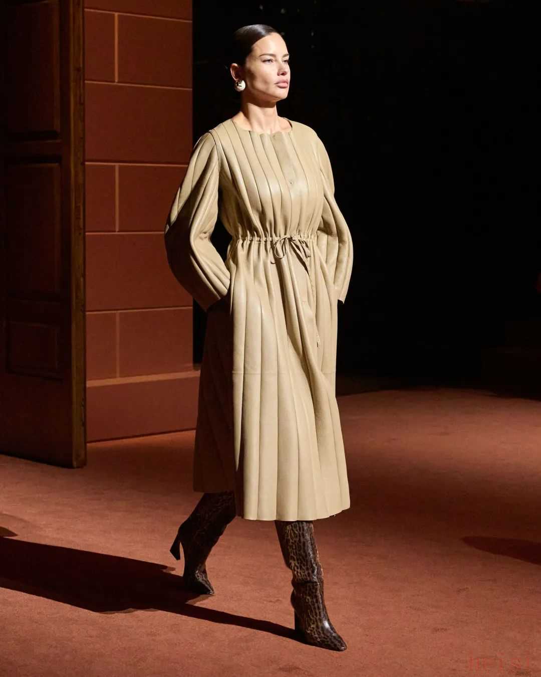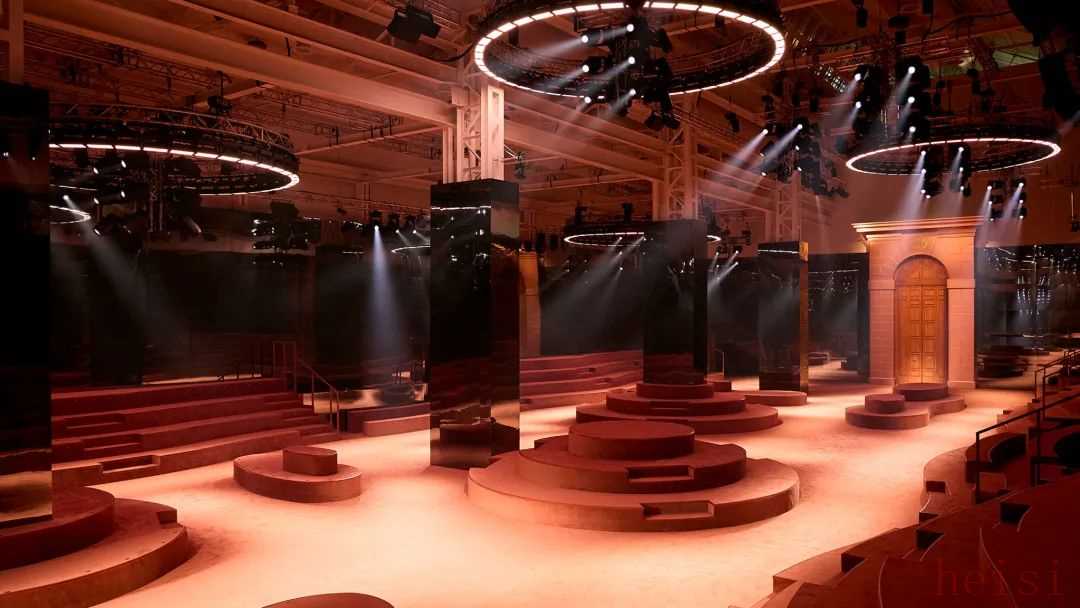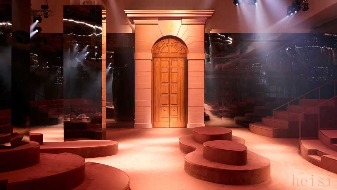 色彩的漸變呼應(yīng)了羅馬黃昏時分的色調(diào),橄欖綠、石墨色、巧克力色到汽油藍(lán);演變?yōu)橛篮闳章鋾r分的熾熱色調(diào),肉桂色、陶土色、猩紅色和塵土玫瑰色;最后,在光澤與啞光的對比中展現(xiàn)羅馬式的午夜魅力。 向左滑動查看更多←