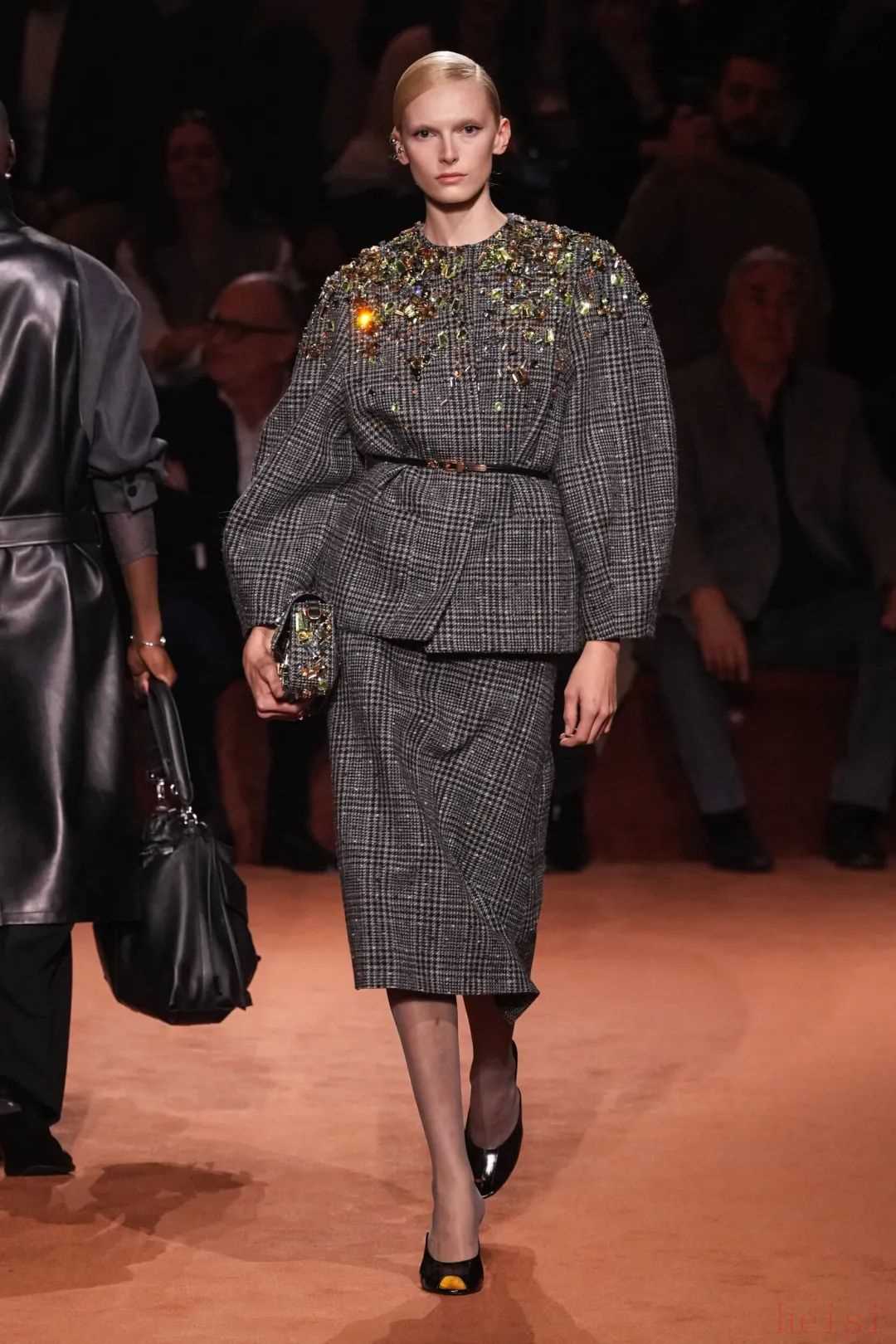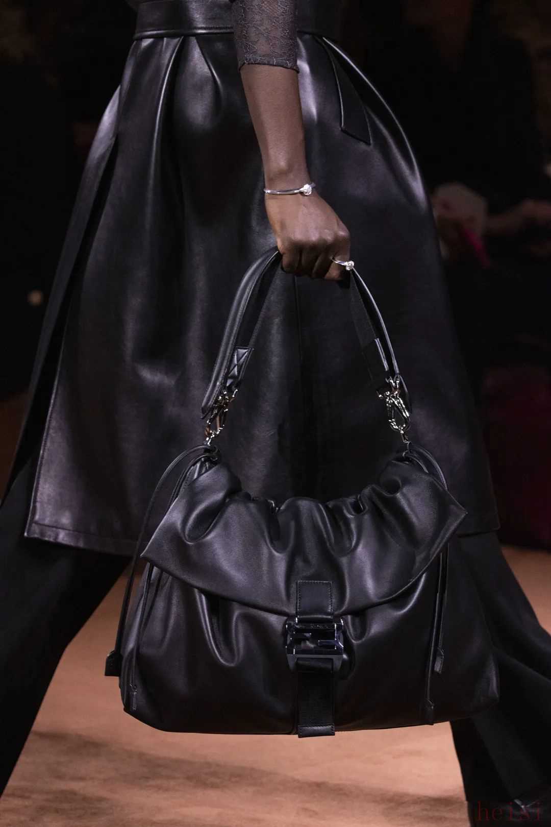 在包飾方面,經(jīng)典手袋以煥新姿態(tài)亮相,Peekaboo及Baguette彰顯永恒格調(diào),以剪羊毛嵌花、迪斯科亮片與凹槽麂皮工藝營造戲劇張力。FENDI Lui旅行手袋以柔韌廓形亮相,搭配采用羅馬皮革打造的流浪包,金屬FF標(biāo)識如星辰點(diǎn)綴其間。 向左滑動查看更多←