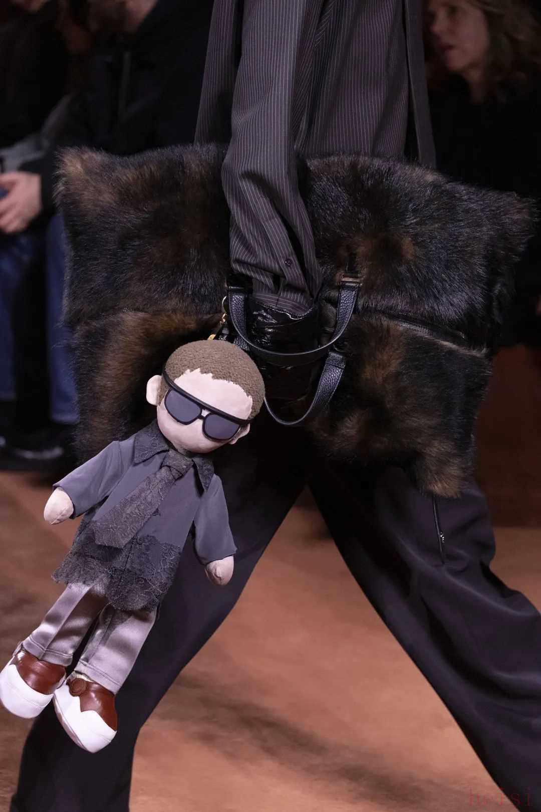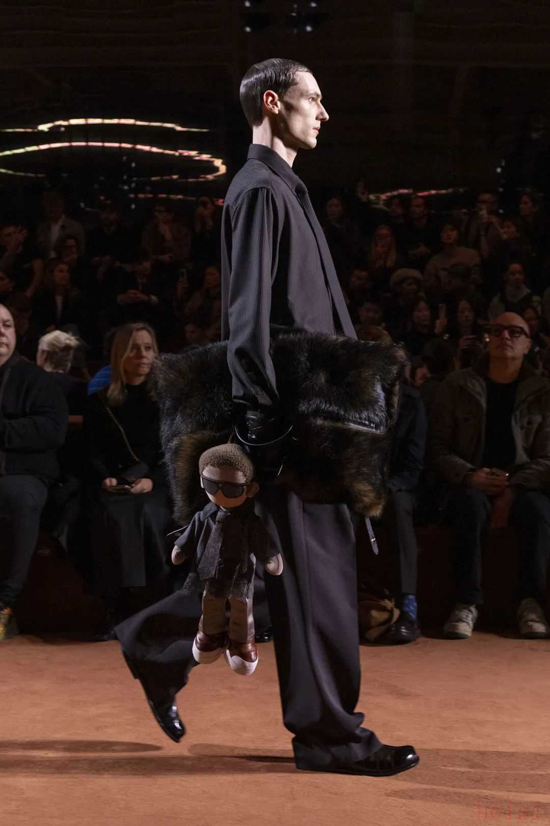 秀場彌漫著仿若家庭聚會派對的熱烈氛圍,西裝造型也放下了嚴(yán)謹(jǐn)肅穆,模特們手持毛絨玩偶登場,展露出品牌標(biāo)志性的趣味設(shè)計風(fēng)格。