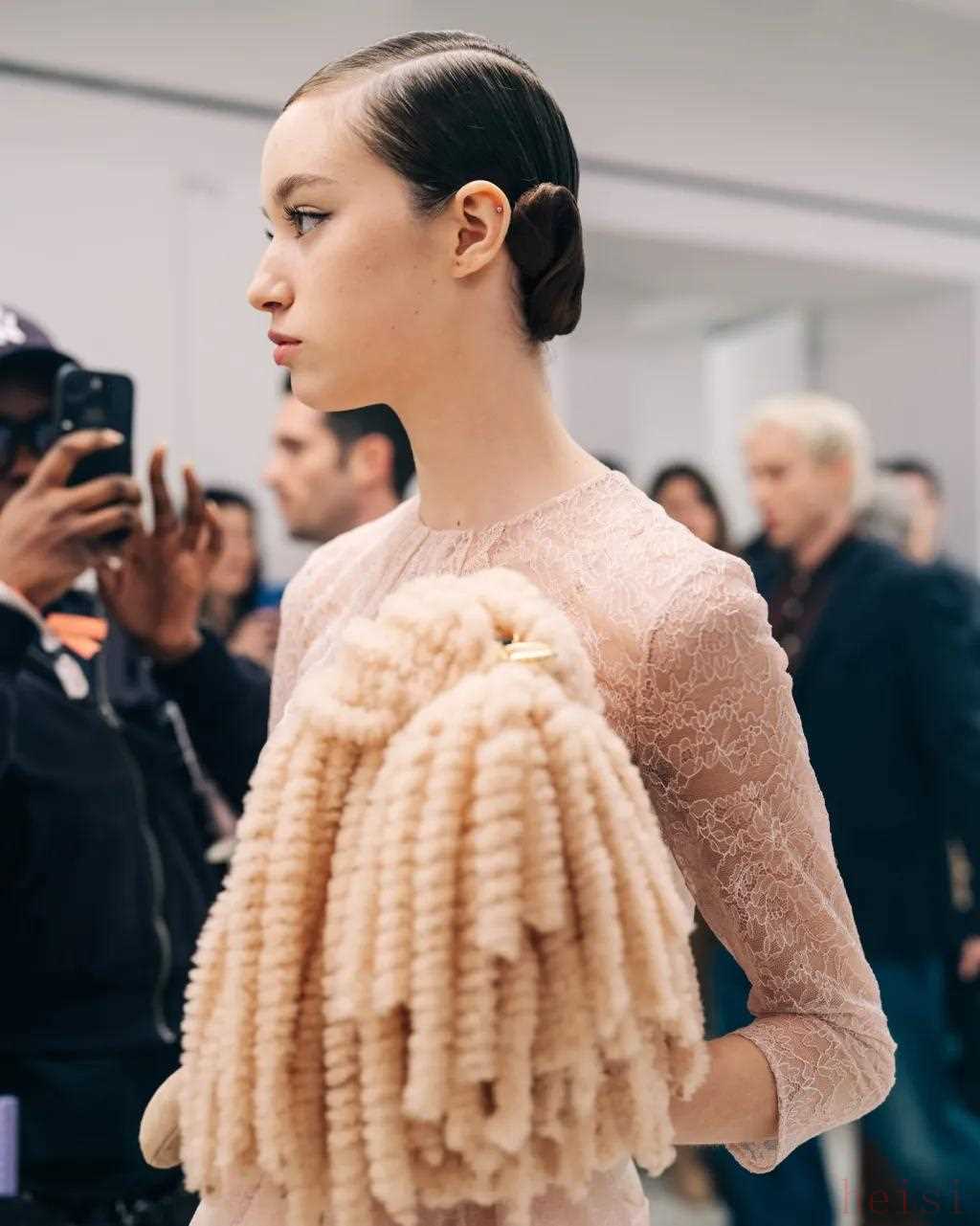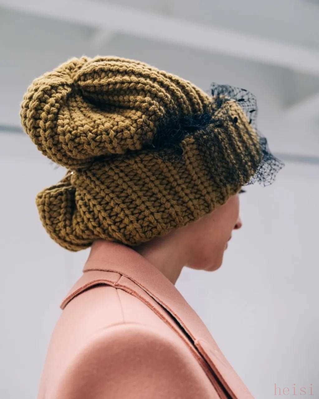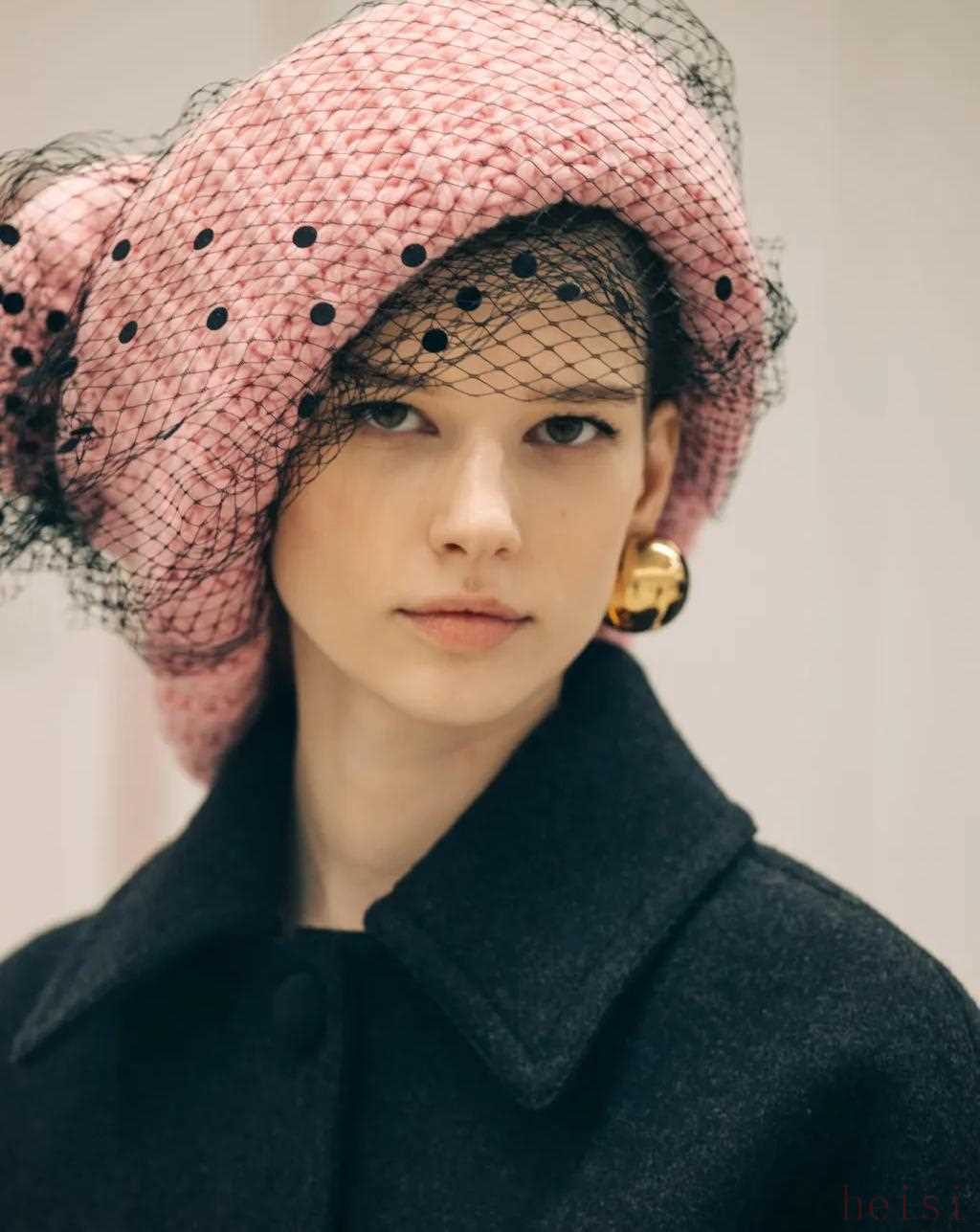 比起深究典藏檔案,這位設(shè)計師更愿意通過品牌的風(fēng)格密碼去展露情感,覆蓋網(wǎng)紗的寬大針織帽是對于祖母Adele Casagrande的致敬,Silvia說祖母總是用這種網(wǎng)紗裝飾發(fā)髻,盤發(fā)模特的的發(fā)髻也被設(shè)計成無限符號的形狀?;厮葸^去才能展望未來,“FENDI讓我憧憬未來。” Silvia這樣說道。