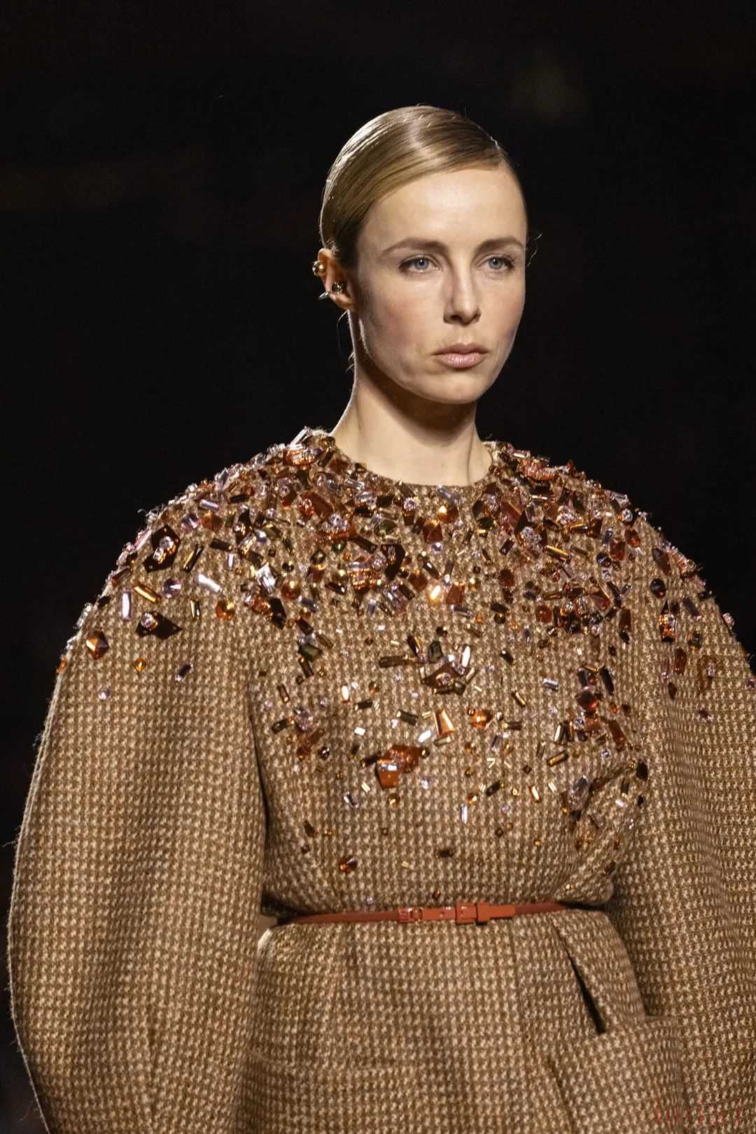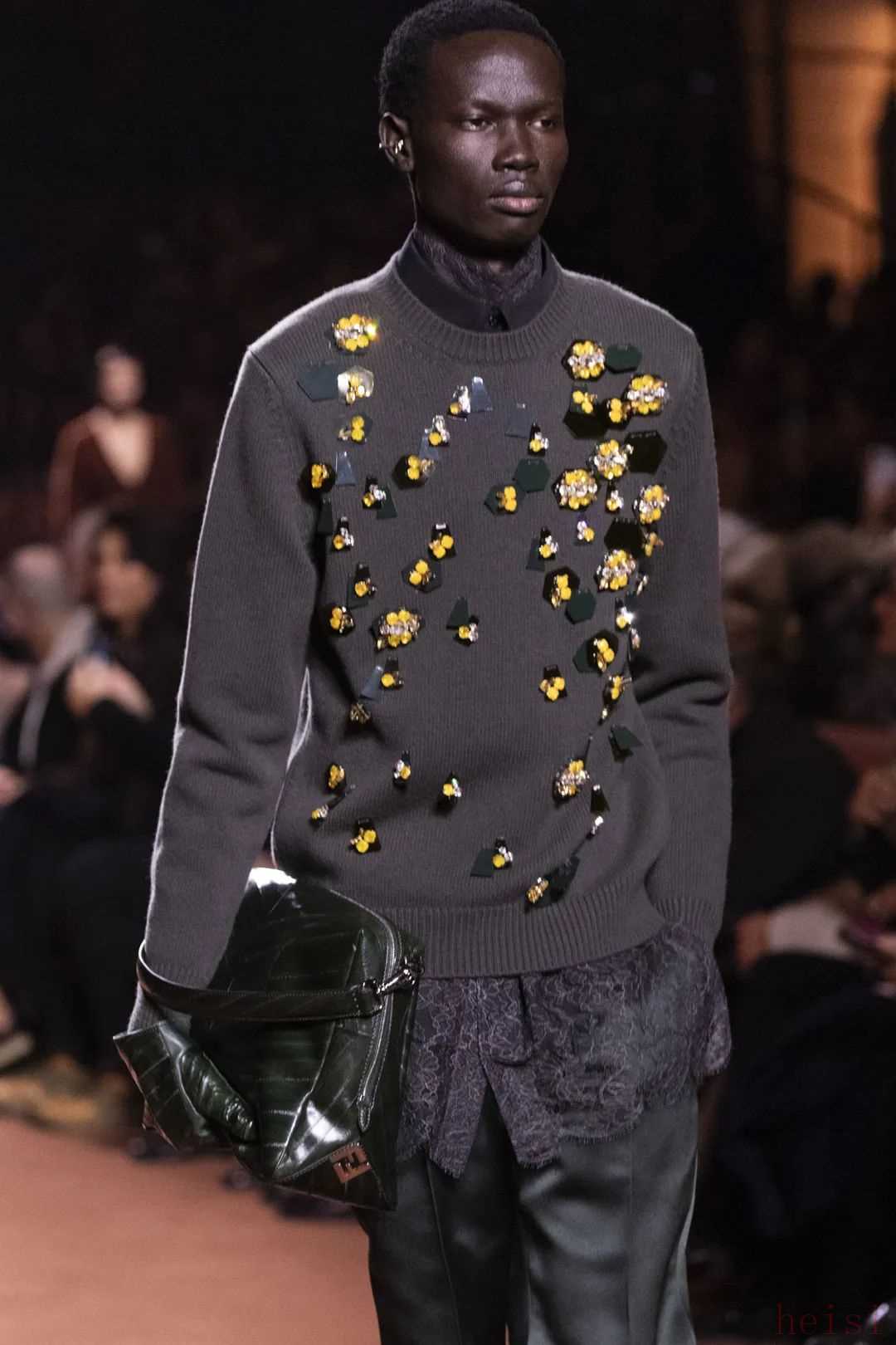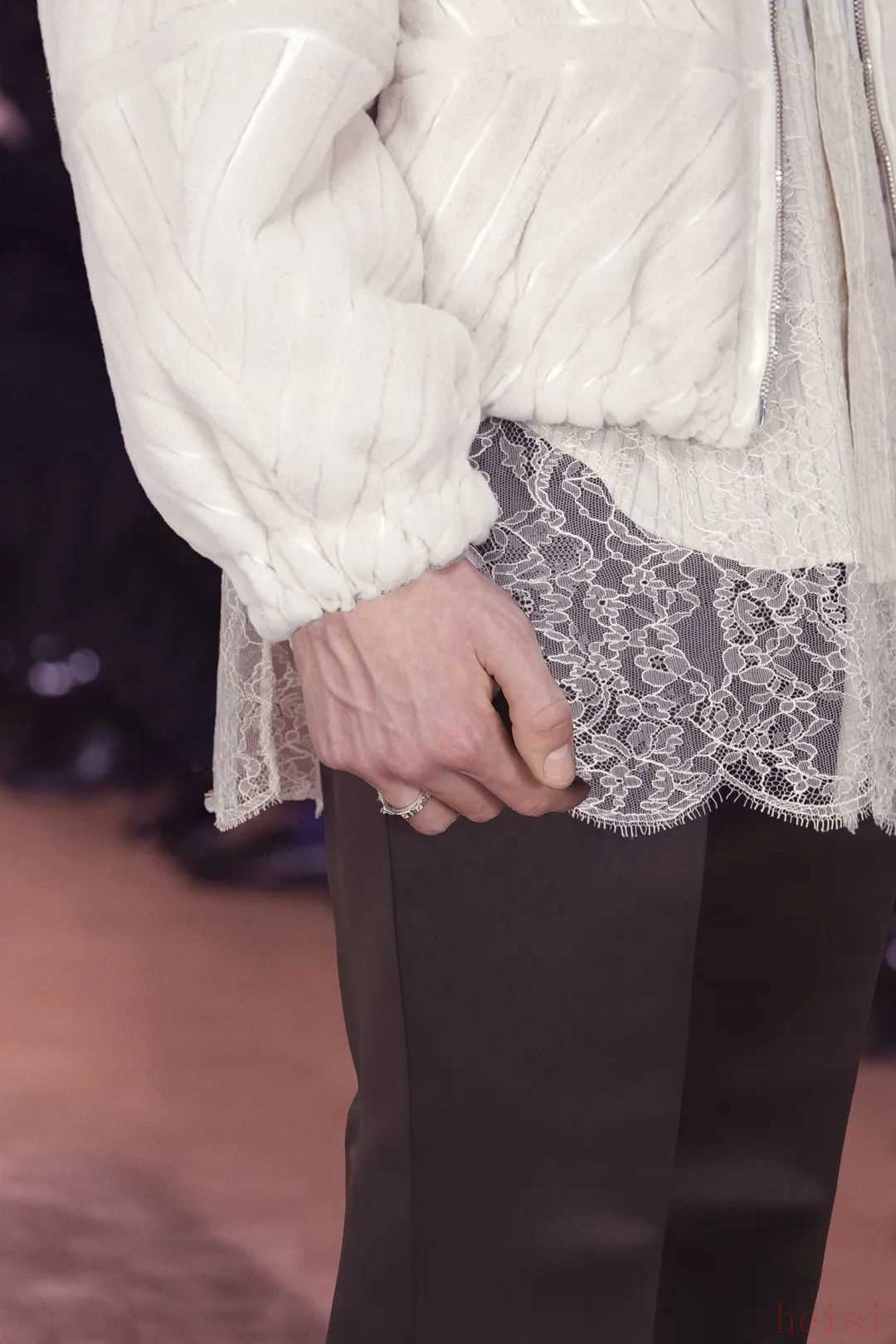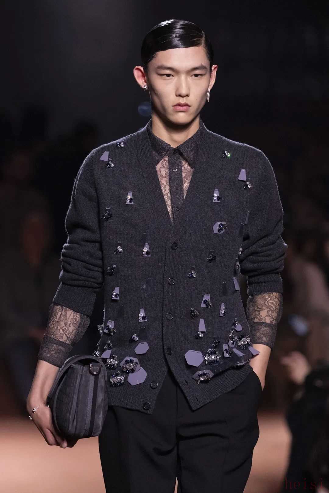 男裝與女裝并非涇渭分明,而是隱約而巧妙地彼此映襯。點(diǎn)綴在男裝當(dāng)中的蕾絲是夜幕和神秘氤氳,巧飾在針織衫上的水晶刺繡、鏡面釘珠與寶石,化作垂暮夜空里的繁星,述說著浩瀚星河里的星光軼事。