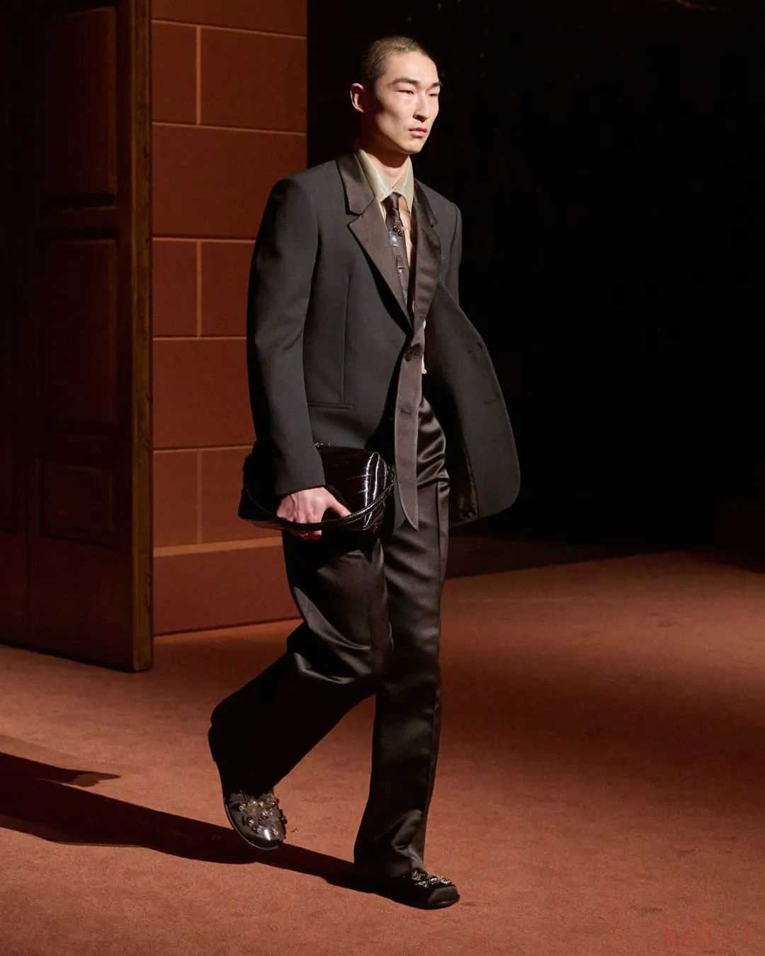 本季系列傾注了FENDI作為一家百年時裝屋的意象派詩篇,跨越了FENDI家族五代人的情感記憶,展現(xiàn)了品牌獨(dú)有的設(shè)計理念:在莊重與詼諧的交融中,融入了羅馬式的嚴(yán)謹(jǐn)。跟以往優(yōu)雅的單色調(diào)西裝不同,本季眾多男裝造型以對比鮮明的顏色和紋理為點(diǎn)綴。