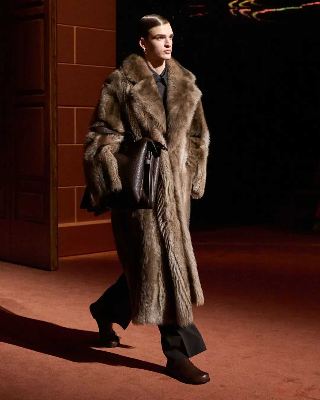 從皮草披肩與手袋工坊起步的FENDI,以精湛的皮草制衣技術(shù)為本季獻(xiàn)上華麗新裝,獨(dú)特的手工鑲嵌技藝將羊毛制成仿似皮草一般的質(zhì)感,亦真亦假。未經(jīng)裁剪的男裝外套則以隱藏的馬汀格拉帶子包裹起來,搭配修長的皮草披肩,營造出戲劇性的效果。