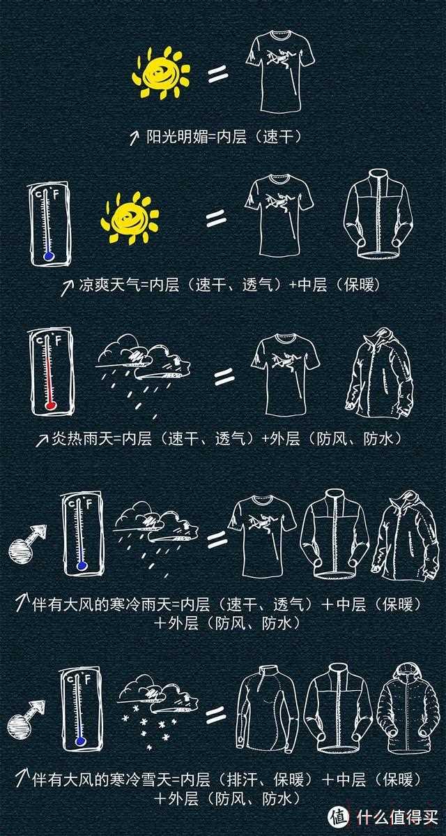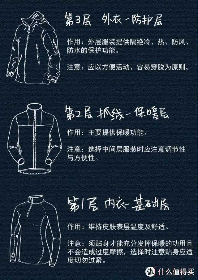 現(xiàn)在非常流行的所謂三層穿衣大法,就是在戶外穿衣選擇上,由內(nèi)到外的依次分為:基礎(chǔ)層(內(nèi)層),保暖層(中層)和防護(hù)層(外層)。