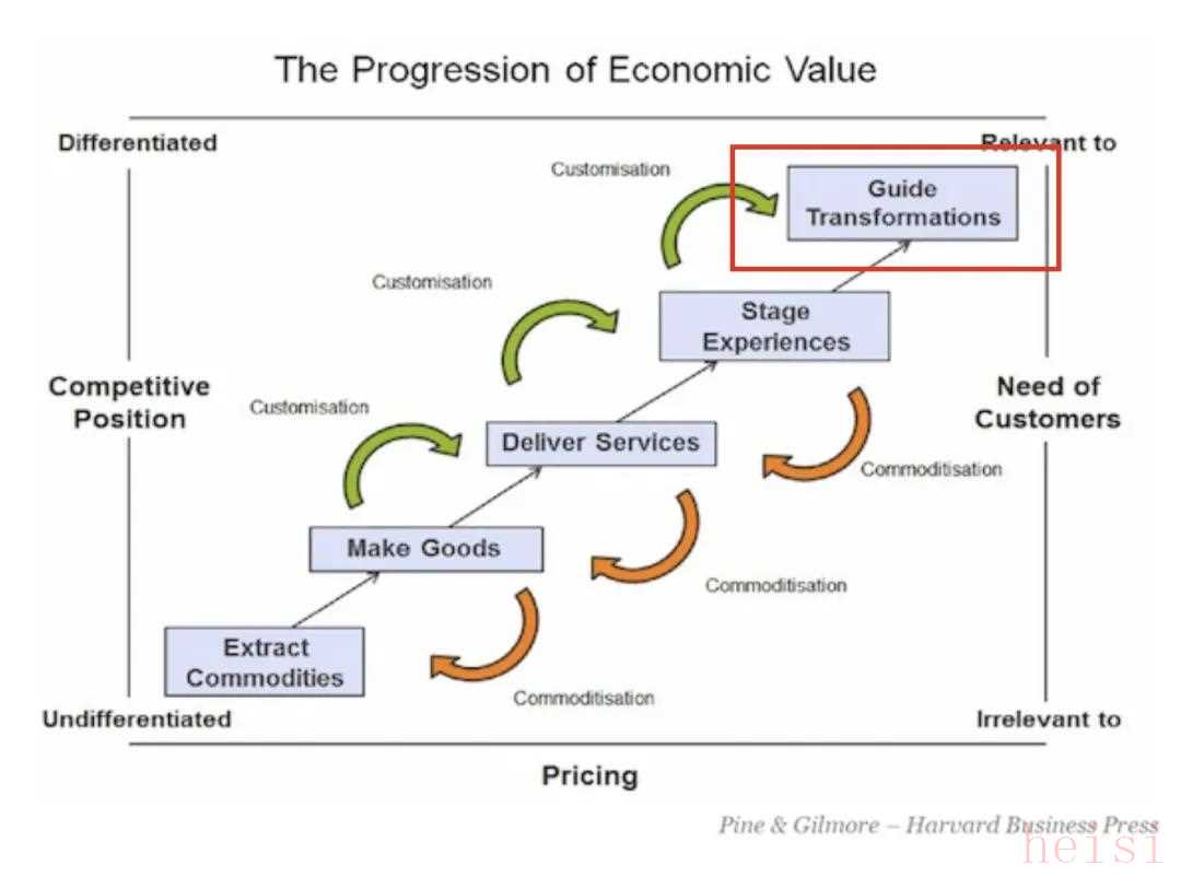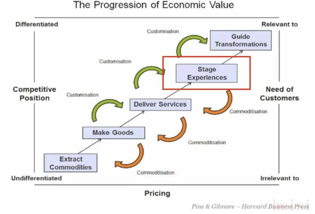 wuhu貼士:經(jīng)濟(jì)價(jià)值遞進(jìn)系統(tǒng)上圖為經(jīng)濟(jì)價(jià)值遞進(jìn)系統(tǒng)的示意圖,從左下到右上,分別為提取初級(jí)產(chǎn)品(Extract Commodities)、制造產(chǎn)品(Make Goods)、交付服務(wù)(Deliver Services)、營(yíng)造體驗(yàn)(Stage Experience)和引導(dǎo)變革(Guide Transformation)。隨著工業(yè)發(fā)展和競(jìng)爭(zhēng)加劇,越位于左下角的階段,越容易被同質(zhì)化,品牌或制造商越難在此找到利潤(rùn)空間;反之,越能和其他競(jìng)爭(zhēng)者產(chǎn)生差異化,并找到利潤(rùn)空間。