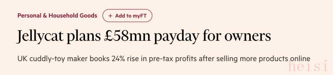 10月,金融時(shí)報(bào)披露了Jellycat 2023年的營(yíng)收情況。據(jù)報(bào)道,Jellycat年?duì)I收總額合2億英鎊(約人民幣18.5億元),較前年增長(zhǎng)37%,稅前利潤(rùn)合6700萬(wàn)英鎊(約人民幣6.2億元),較前年增長(zhǎng)24%。此外,Jellycat計(jì)劃向股東分發(fā)總共5800萬(wàn)英鎊的股息,是去年的6.4倍。