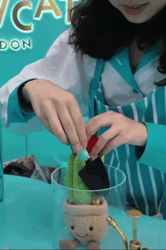 而且就在今年5月,JELLYCAT和野獸派聯(lián)名的快閃花店北京開(kāi)業(yè)。店員給“盆栽”松土、噴水的視頻,在互聯(lián)網(wǎng)上小小的火了一把。這種服務(wù)方式,最早出現(xiàn)在Jellycat于去年9月在紐約開(kāi)的快閃店中。