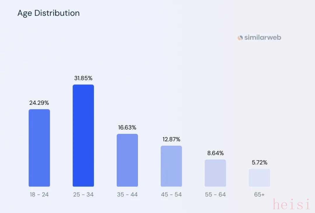 據(jù)數(shù)據(jù)平臺(tái)similarweb統(tǒng)計(jì),Jellycat的受眾在年齡分布上,以25-34歲占31.85%排名最高,以18-24歲占24.29%次之,二者合計(jì)占56.14%,換言之,Jellycat的主要受眾為Z世代和年輕的千禧一代。