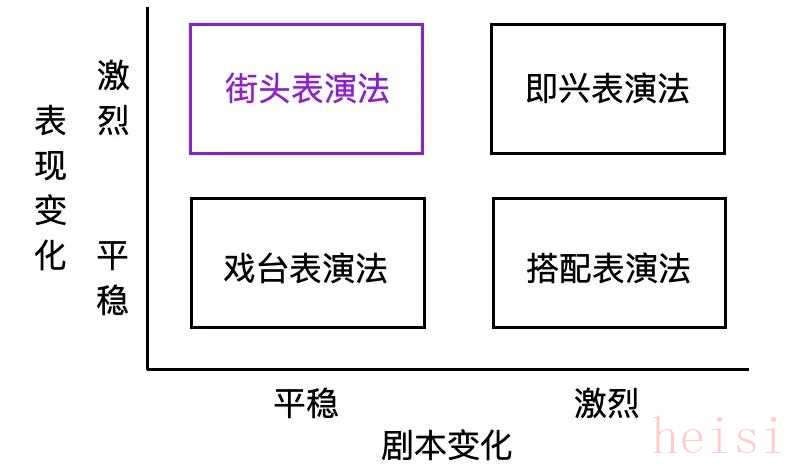 表演根據(jù)劇本和表現(xiàn)的激烈程度,分為四類,分別為戲臺(tái)表演法、搭配表演法、街頭表演法和即興表演法。