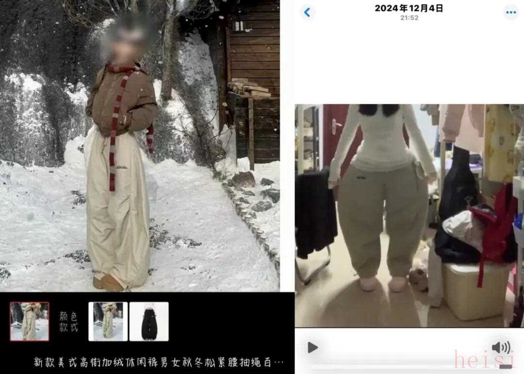 陳茵兮在電商平臺(tái)上購買的神褲賣家秀(左)和她收到后試穿時(shí)的樣子(右)。講述者供圖