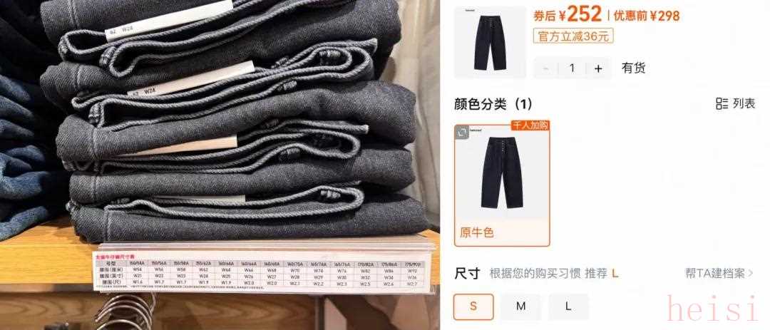優(yōu)衣庫的女裝牛仔褲(左)涵蓋廣泛尺碼選擇,部分品牌尺碼僅有S/M/L(右)。講述者供圖