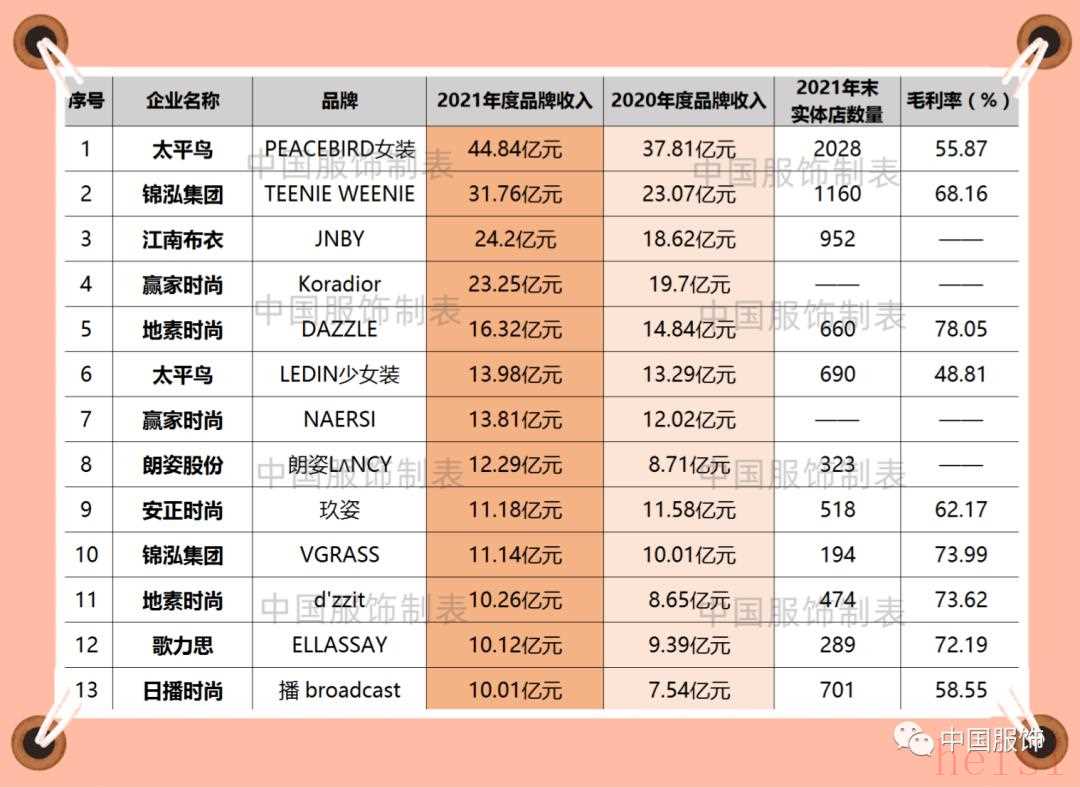 其中,品牌年收入超40億元的有1個(gè),為太平鳥(niǎo)旗下PEACEBIRD女裝以44.84億元收入居首;品牌年收入超30億元的有1個(gè),為錦泓集團(tuán)旗下TEENIE WEENIE以31.76億元收入緊隨其后;品牌年收入超20億元的有2個(gè),分別是江南布衣旗下JNBY以24.2億元收入位列第三、贏家時(shí)尚旗下Koradior以23.25億元收入排名第四;DAZZLE、LEDIN少女裝、NAERSI、朗姿L?NCY、玖姿、VGRASS、d'zzit、ELLASSAY和播 broadcast9個(gè)品牌收入超10億元。