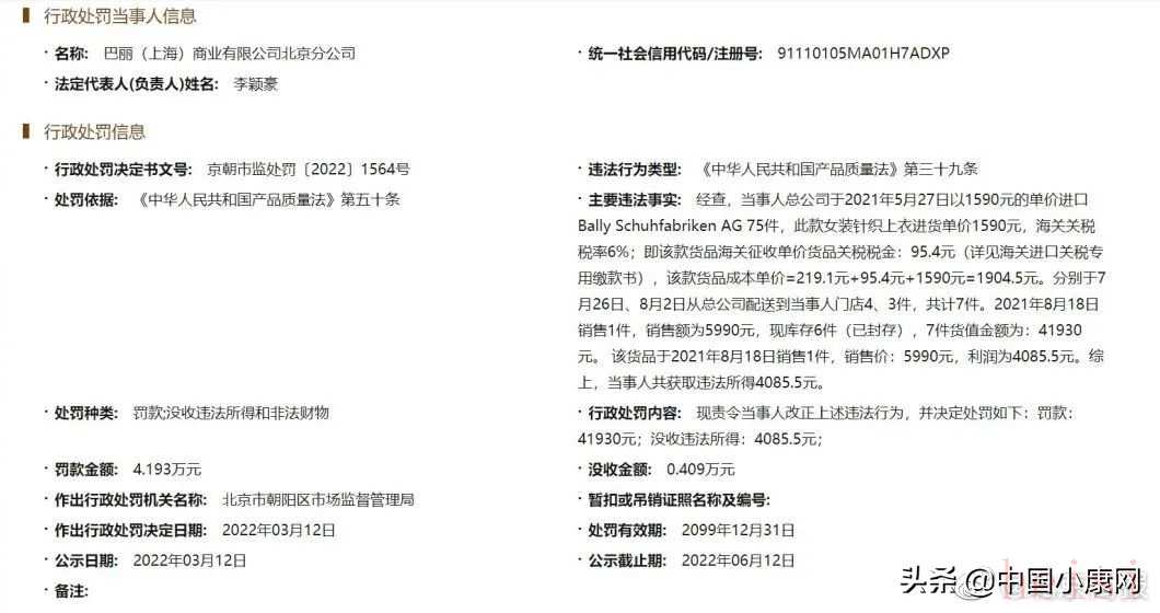 3月28日,國家企業(yè)信用信息公示系統(tǒng)官網(wǎng)顯示,Bally關(guān)聯(lián)公司巴麗(上海)商業(yè)有限公司北京分公司日前被北京市朝陽區(qū)市場監(jiān)督管理局罰款4.1萬余元,沒收違法所得4085.5元。