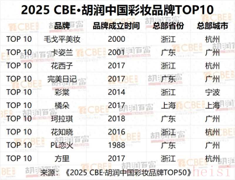 國(guó)家統(tǒng)計(jì)局?jǐn)?shù)據(jù)顯示,2024年全國(guó)化妝品零售市場(chǎng)規(guī)模達(dá)到4357億元,相比2014年的1825億元,增長(zhǎng)了139%。在為數(shù)眾多的彩妝企業(yè)中,毛戈平美妝、卡姿蘭、花西子、完美日記、彩棠、橘朵、珂拉琪、花知曉、PL戀火、方里躋身“2025 CBE·胡潤(rùn)中國(guó)彩妝品牌TOP10”。晨光生物、新和成、華熙生物分列“2025 CBE·胡潤(rùn)中國(guó)美妝原料企業(yè)”前三位。