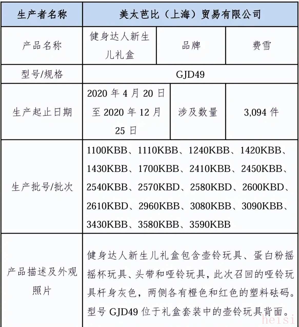 另據(jù)上海發(fā)布9月13日消息,上海市場監(jiān)管局介紹,美太芭比(上海)貿(mào)易有限公司自2024年9月13日至2025年3月12日召回2020年4月20日至2020年12月25日生產(chǎn)的費雪牌健身達(dá)人新生兒禮盒,共計3094件。
