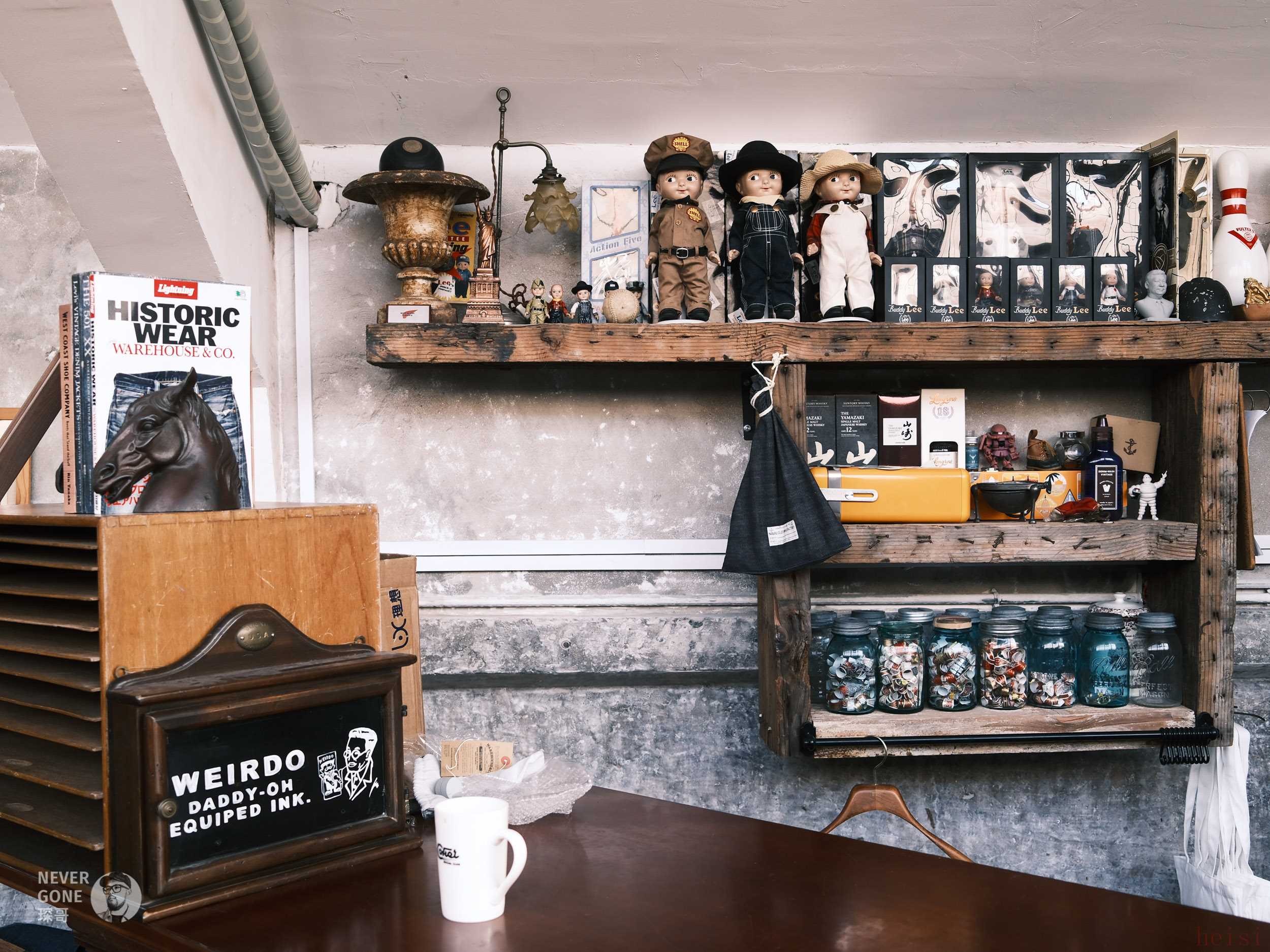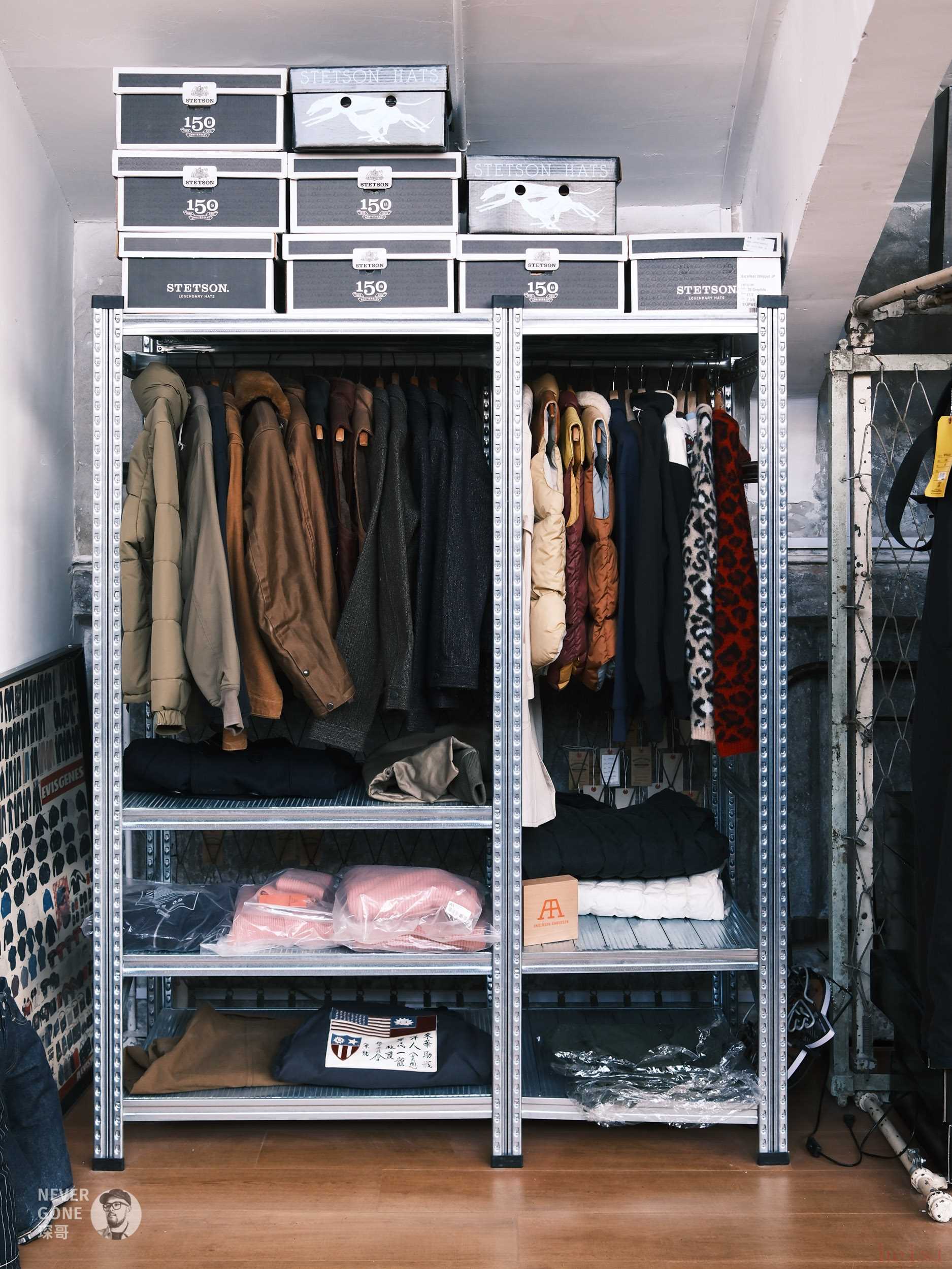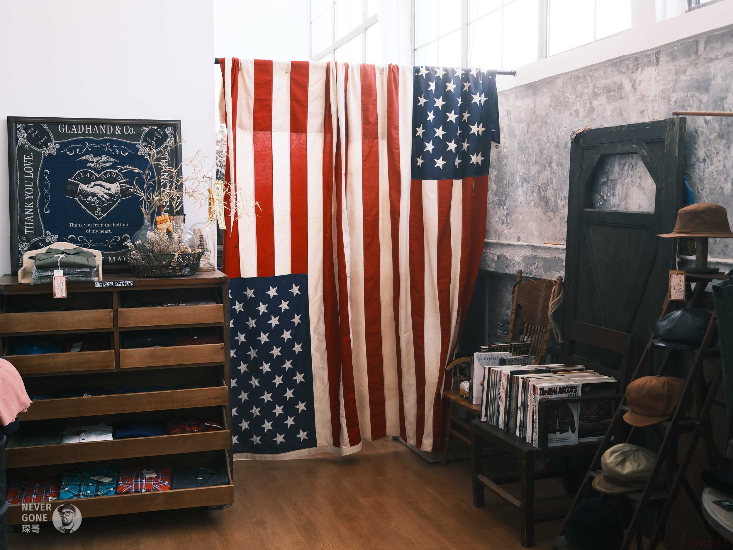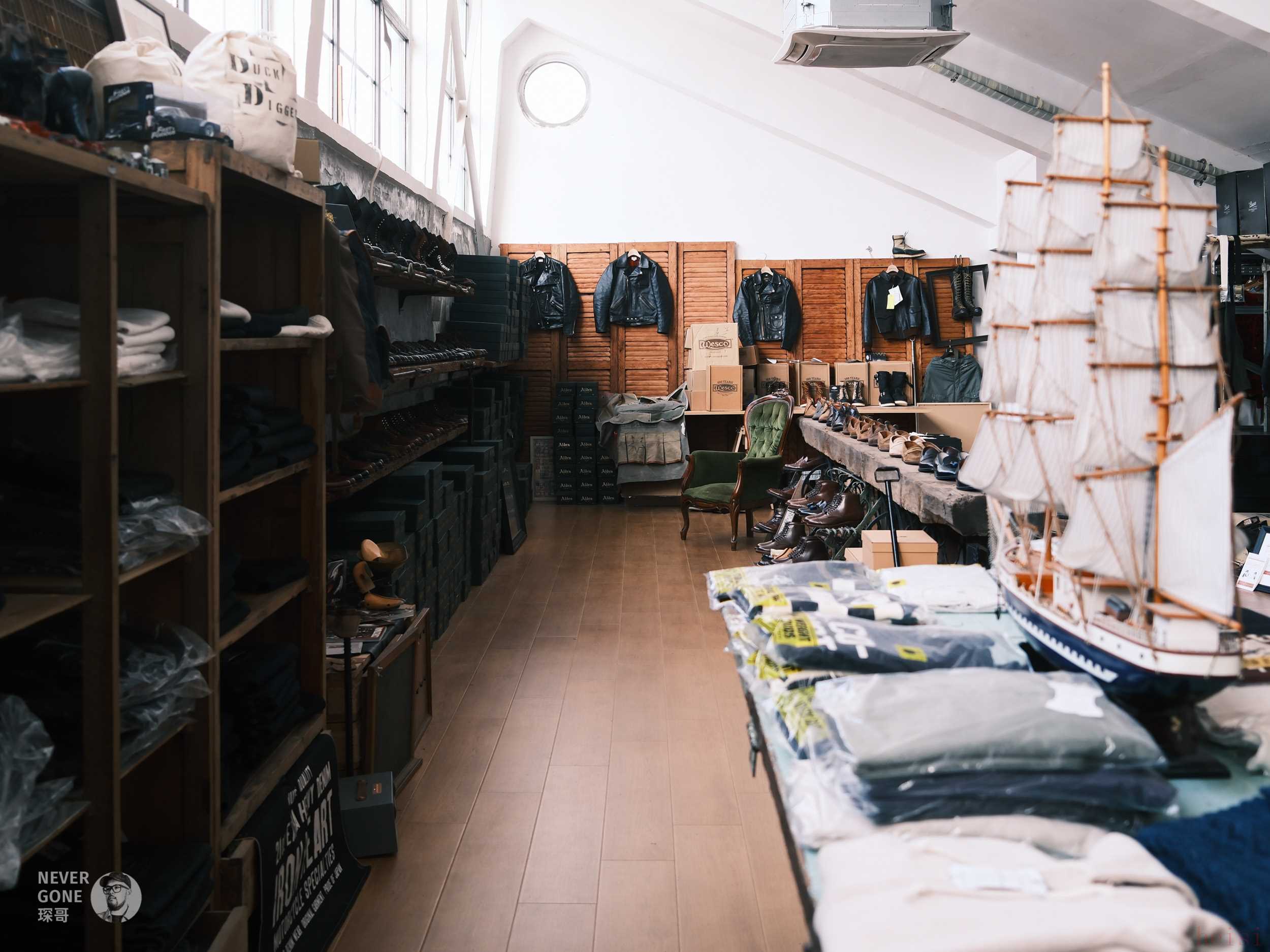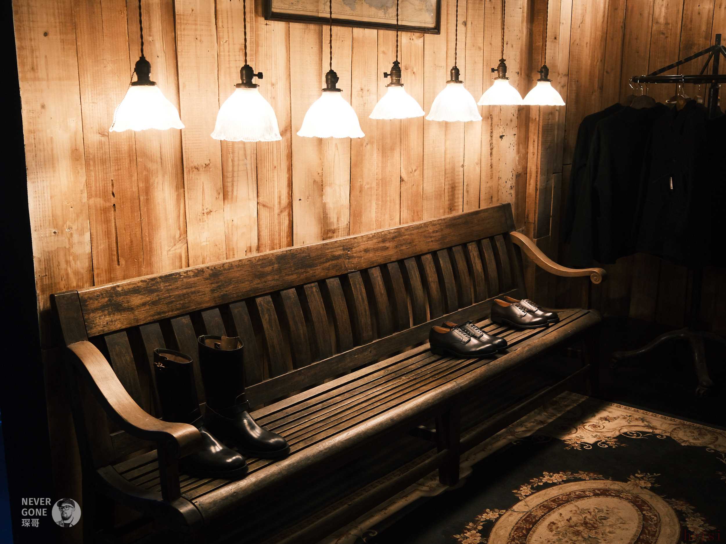 復(fù)古店在里頭,共有兩層樓。一樓非常的Black Code,跟名古屋Black Sign風(fēng)格貼近。因?yàn)榈曛骼诟缯f(shuō)Black Sign是他最?lèi)?ài)的品牌