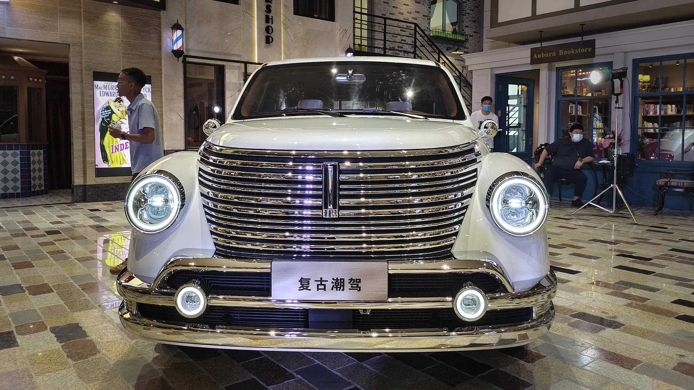 車型整體的外觀設(shè)計非常復(fù)古,采用的是整體老爺車的造型,前方兩個圓形大燈和兩個圓形霧燈,辨識度非常高,而與古典老爺車不同的是,前臉采用了大面積的鍍鉻裝飾中網(wǎng),而中網(wǎng)下方采用了三條粗壯的鍍鉻裝飾條,所以整個前臉能夠完成復(fù)古與豪華流行的結(jié)合。