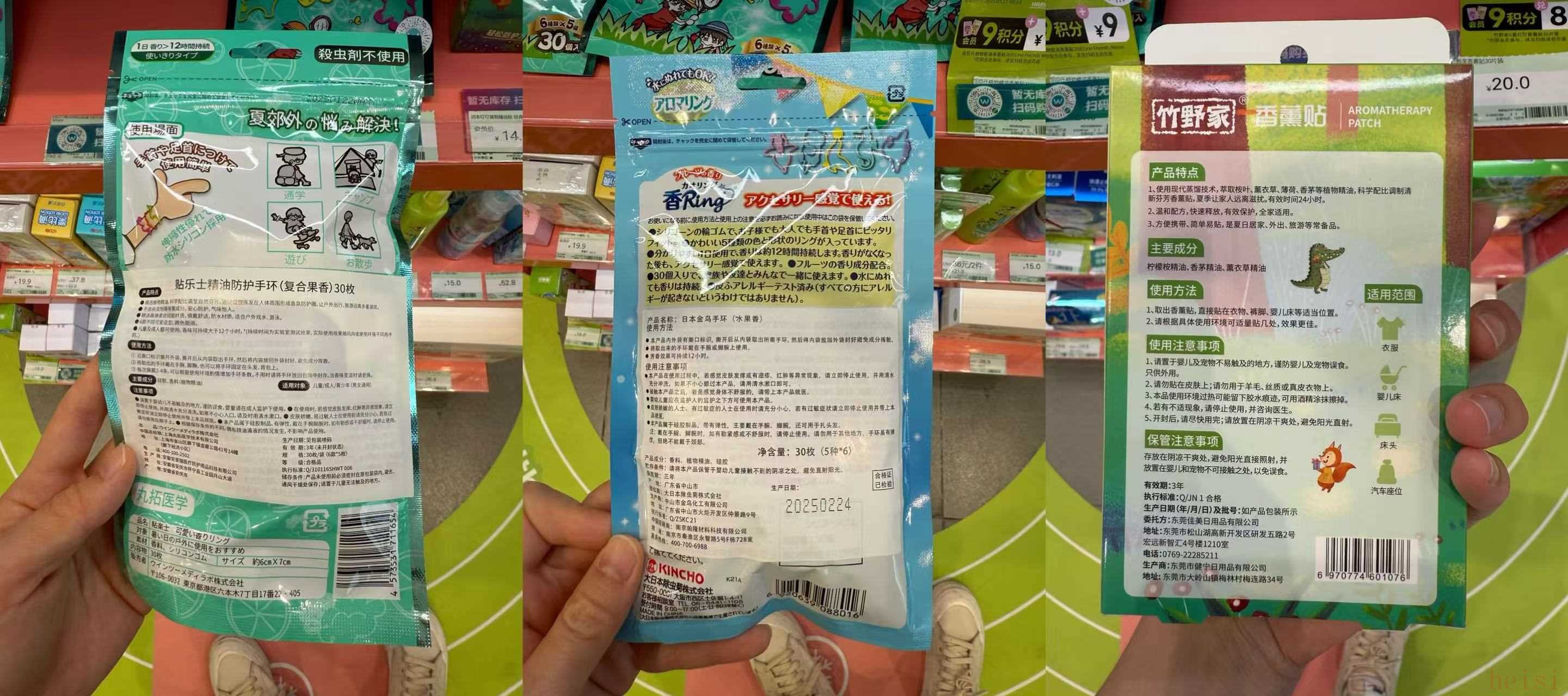 其他商超也存在類似情況。在三河市燕郊的沃爾瑪內,驅蚊產(chǎn)品貨架上放置有包括驅蚊液、電熱蚊香液、蚊香、手環(huán)、貼紙等多類型產(chǎn)品。其中,手環(huán)和貼紙類產(chǎn)品的包裝均未明確“驅蚊防蚊”功效,產(chǎn)品包裝亦無農藥登記證等信息,涉及產(chǎn)品包括潤本叮叮植物精油貼、潤本叮叮植物精油香圈、日本金鳥手環(huán)?!皾櫛径6V参锞唾N”的產(chǎn)品外包裝還印有“一貼可抵8h、夏日‘芳香罩’、夏季出行隨貼隨用、全家適用”等信息。