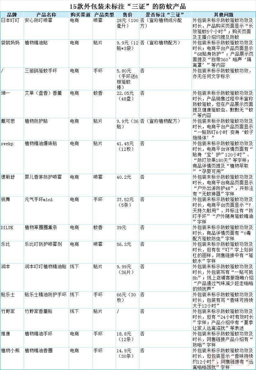 總體來看,蚊香、驅蚊花露水等傳統(tǒng)驅蚊產(chǎn)品對農藥登記證號、產(chǎn)品標準號以及農藥生產(chǎn)許可證號(即“三證”)的標志較為規(guī)范。無論線下還是電商平臺,以天然成分、植物萃取等為賣點的防護貼、驅蚊手環(huán)類產(chǎn)品,則在實際銷售中以“防叮”“遠離夏季嗡嗡滋擾”等內容,打起了防蚊驅蚊擦邊球。另外,24款產(chǎn)品中,有15款未在外包裝中標注“三證”,其中防護貼、防護手環(huán)占比達三分之二。