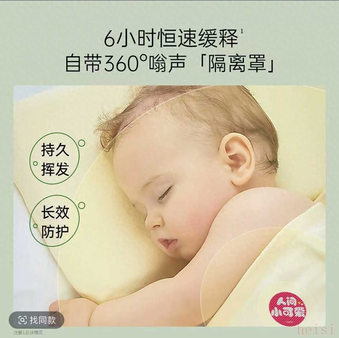 在某電商平臺袋鼠媽媽嬰童用品旗艦店,一款植物精油貼的產(chǎn)品頁面提到了“天然植萃精油貼 6H貼身防護”的內容,從產(chǎn)品名稱及頁面展示內容來看,并未明確提及防蚊驅蚊相關內容,但在產(chǎn)品介紹及詳情介紹中,均有暗示防蚊子叮咬的相關內容。在該產(chǎn)品的視頻介紹中,字幕還提及“夏天帶孩子外出被咬得一身包;8H長效防護不含避蚊胺?!痹诋a(chǎn)品詳情中,還出現(xiàn)嬰兒睡眠的圖片,并配以“自帶360°嗡聲‘隔離罩’”的內容,并提示“科學配比植物精油;遠離夏季嗡嗡滋擾;植萃精油釋放氣味驅趕叮擾”。