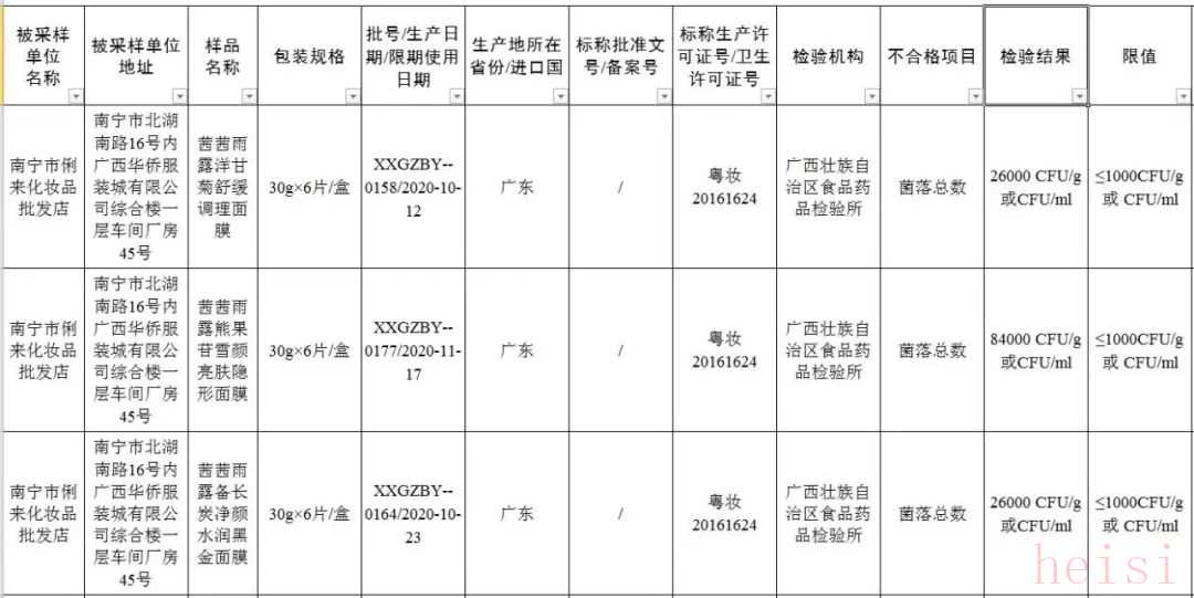 廣州博羿化妝品有限公司生產(chǎn)的茜茜雨露洋甘菊舒緩調(diào)理面膜、茜茜雨露熊果苷雪顏亮膚隱形面膜、茜茜雨露備長炭凈顏水潤黑金面膜和沁顏芯鮮潤·復(fù)活草瞬透沁潤補(bǔ)水面膜,