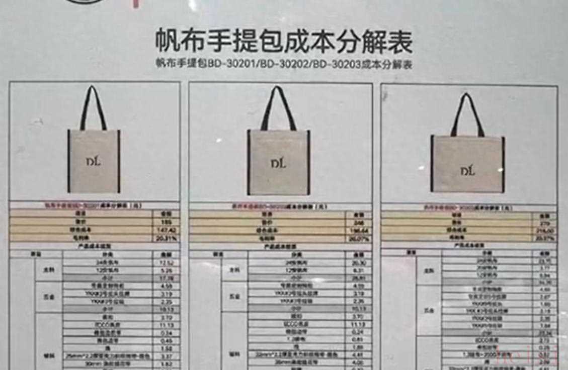 據(jù)胖東來發(fā)布視頻,帆布手提袋所用的生產(chǎn)原料是來自新疆阿克蘇的優(yōu)質(zhì)棉花。在售的6款帆布手提袋均為米白色,價格從180元到270元不等。在商品詳情中,胖東來也將該系列帆布袋的材料、配件等價格進行公示。以180元的帆布袋為例,在成本分解表中顯示,180元帆布袋綜合成本為143.84元,毛利率為20.09%。