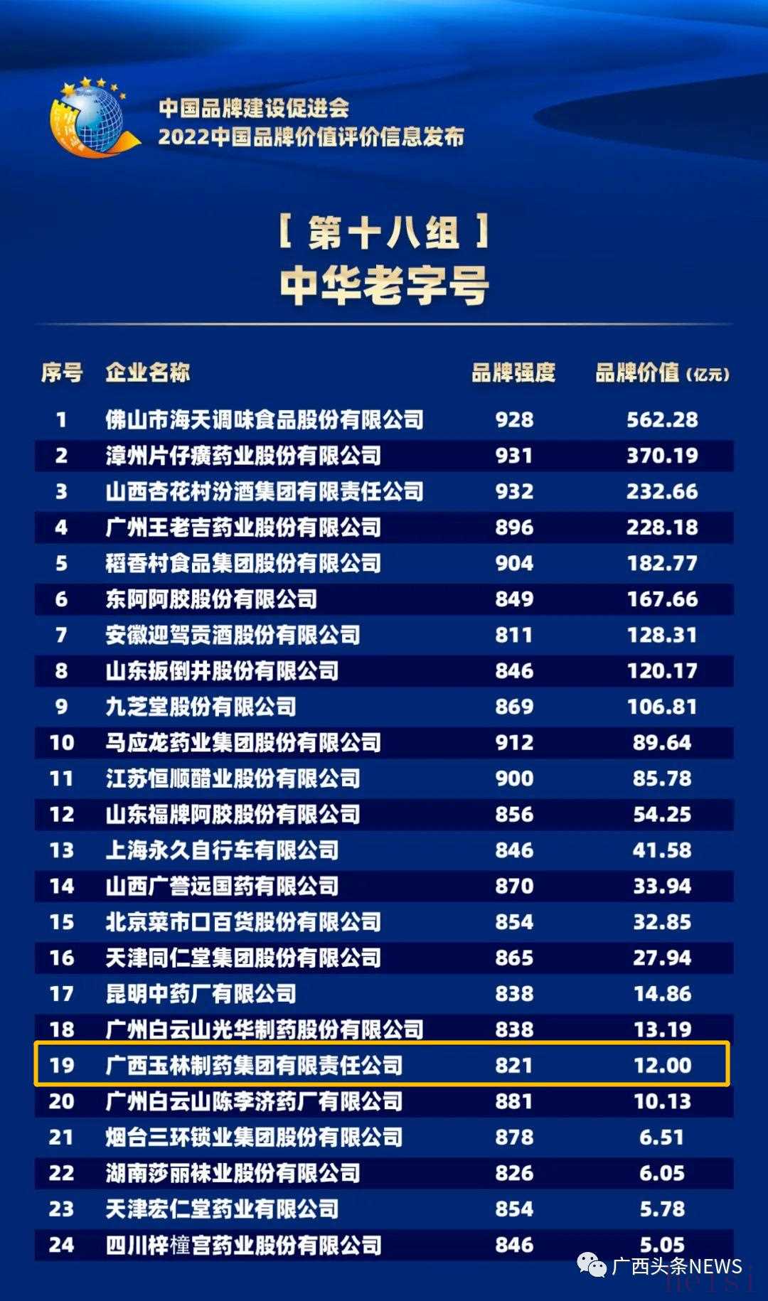 本次品牌價(jià)值評(píng)價(jià)信息發(fā)布中,廣西玉林制藥集團(tuán)有限公司上榜中華老字號(hào)品牌第19位。