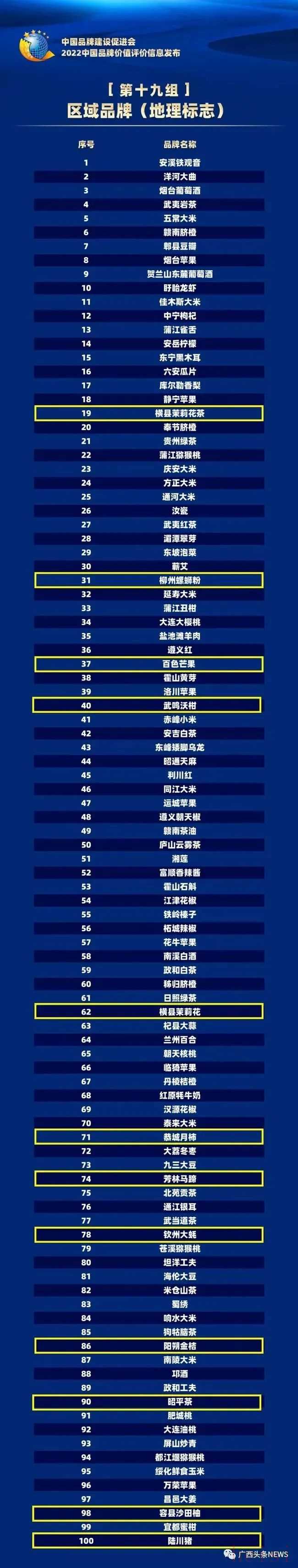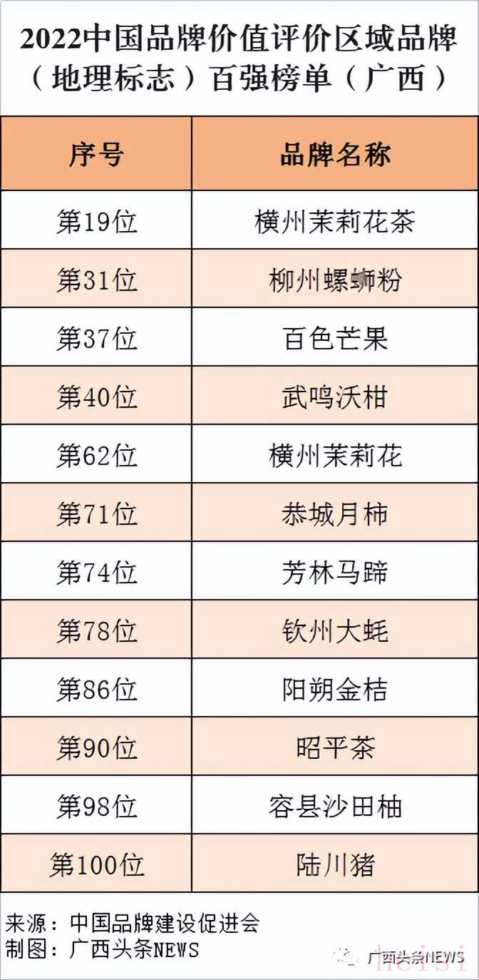 近日“2022中國(guó)品牌價(jià)值評(píng)價(jià)信息”在北京發(fā)布,廣西共有12個(gè)地理標(biāo)志產(chǎn)品品牌上榜2022中國(guó)品牌價(jià)值評(píng)價(jià)區(qū)域品牌(地理標(biāo)志)百?gòu)?qiáng)榜上榜數(shù)量全國(guó)第一!快看看有你家鄉(xiāng)的品牌嗎?