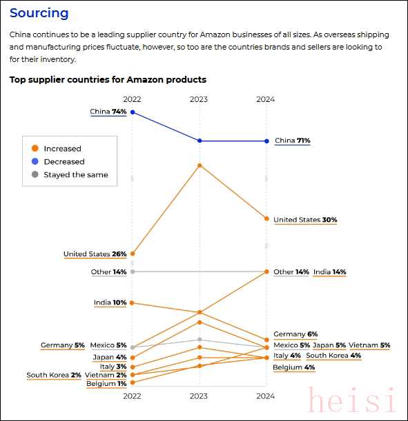 根據Jungle Scout去年發(fā)布的《2024亞馬遜賣家狀況報告》,超過70%的亞馬遜賣家和品牌的貨源在中國。排名第二、第三的貨源國是美國和印度,但占比只有30%和14%。電商情報公司Marketplace Pulse的數據顯示,截至2024年11月,中國賣家在亞馬遜平臺的占比首次超過50%,美國賣家的占比則降至約45%。