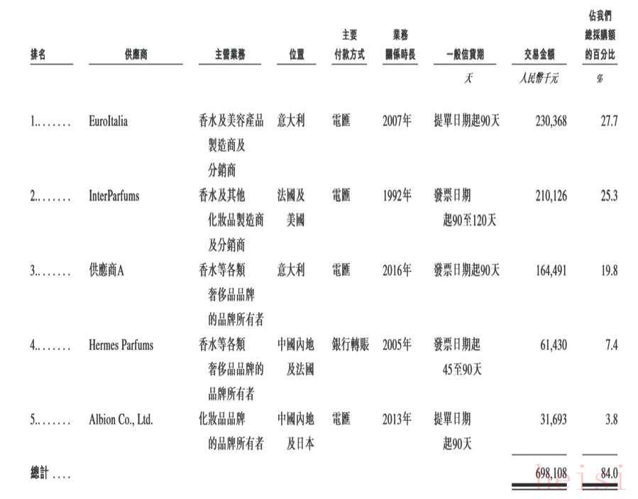 穎通的收入高度集中于香水業(yè)務(wù)(2025財年占總收入的81.7%),而香水業(yè)務(wù)的成功又與少數(shù)幾個核心品牌的表現(xiàn)和合作關(guān)系深度綁定。公司的前5大供應(yīng)商的供貨占比基本能達(dá)到80%上下,非常集中。