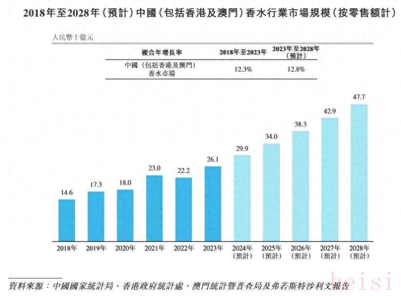 根據(jù)弗羅斯特沙利文的數(shù)據(jù),中國(包括香港及澳門)香水總市場規(guī)模(按零售額計)由2018年的人民幣146億元增加至2023年的人民幣261億元,復(fù)合年增長率約為12.3%,預(yù)計2028年將進(jìn)一步增長至人民幣477億元,2023年至2028年復(fù)合年增長率約為12.8%。