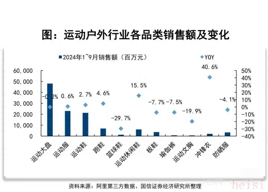 2023年被稱為“沖鋒衣元年”,2024持續(xù)升溫,從2023年8月至2024年9月,魔鏡數(shù)據(jù)顯示沖鋒衣在主流電商平臺(tái)銷售額突破100億元。另據(jù)國信證券研報(bào),運(yùn)動(dòng)戶外所有品類中沖鋒衣的增長斷崖領(lǐng)先,超過40%。瑜伽褲下滑,防曬服顯頹勢,最防風(fēng)的沖鋒衣,正在被時(shí)尚之風(fēng)勁吹。