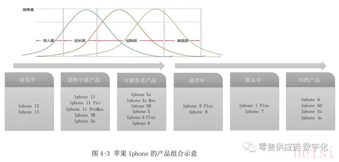 前面提到Portfolio是文件夾的意思,具體到產(chǎn)品組合就是把全公司所有的產(chǎn)品按照產(chǎn)品的特性(比如按客戶細(xì)分、技術(shù)類型、產(chǎn)品分類、產(chǎn)品生命周期、產(chǎn)品形態(tài)等)進(jìn)行分類,像文件夾一樣歸類好,然后進(jìn)行盈利性、成長(zhǎng)性、生命周期階段的分析,進(jìn)而指導(dǎo)公司進(jìn)行新產(chǎn)品投入和老產(chǎn)品退出的決策。以蘋果手機(jī)為例(2020年3月數(shù)據(jù)),這類產(chǎn)品更新?lián)Q代塊,一般會(huì)按照生命周期階段進(jìn)行組合分析,會(huì)得到如下圖4-3所示的產(chǎn)品組合。