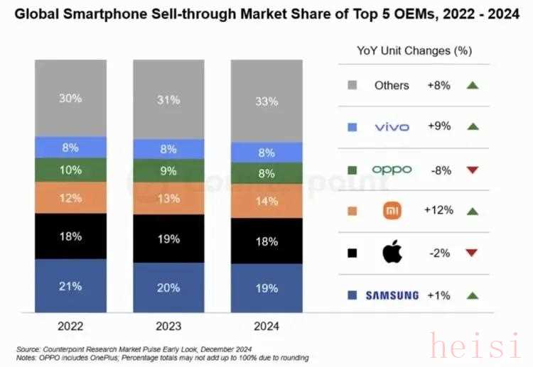 在國(guó)內(nèi)市場(chǎng),三星手機(jī)似乎被國(guó)產(chǎn)手機(jī) “吊打”,但在全球范圍內(nèi),三星電子的實(shí)力依然強(qiáng)悍。2024 年,三星手機(jī)全球出貨量 5750 萬(wàn)臺(tái),穩(wěn)居全球第一,就連國(guó)內(nèi)銷量最高的小米,以 4240 萬(wàn)臺(tái)的成績(jī)也只能排在第三。