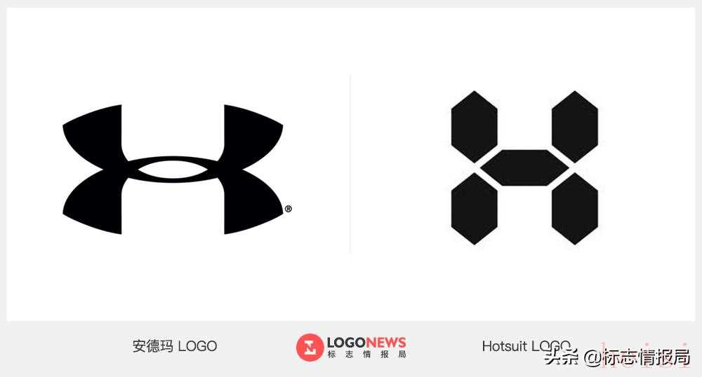 不過從視覺上來看,兩個(gè)品牌有著完全不同的表達(dá)形式,安德瑪?shù)腖OGO是其品牌名稱首字母「UA」相交組合而成,看起來有點(diǎn)像「H」,而Hotsuit 則直接用首字母「H」設(shè)計(jì)成類似電子屏展示的數(shù)字效果。