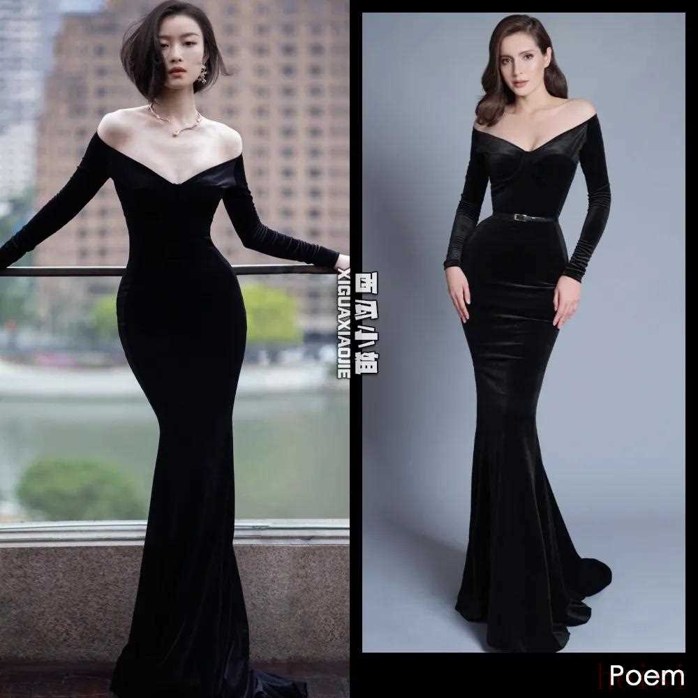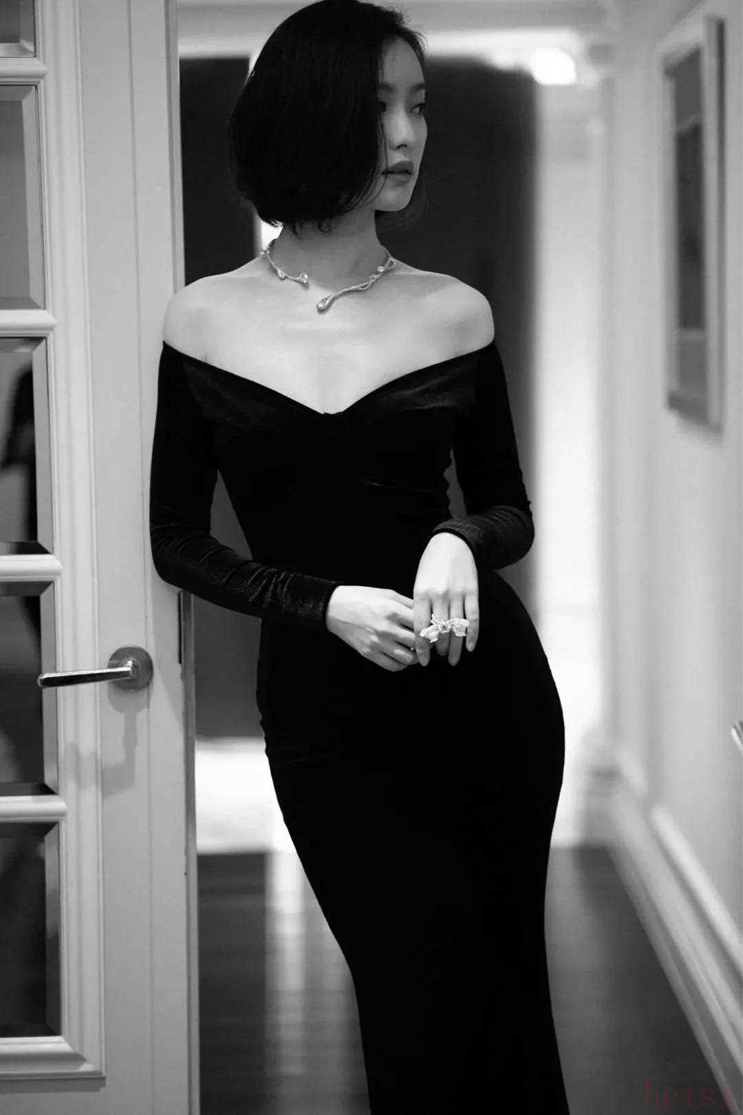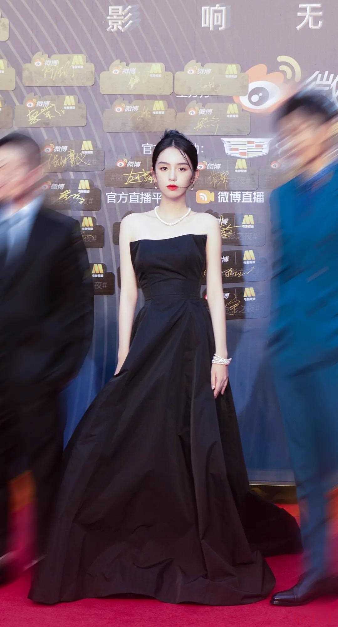 倪妮還有一次穿的黑絲絨禮服,也是迷離高級的性感。設計極為簡單,讓人的視線忍不住在她的身上停留。