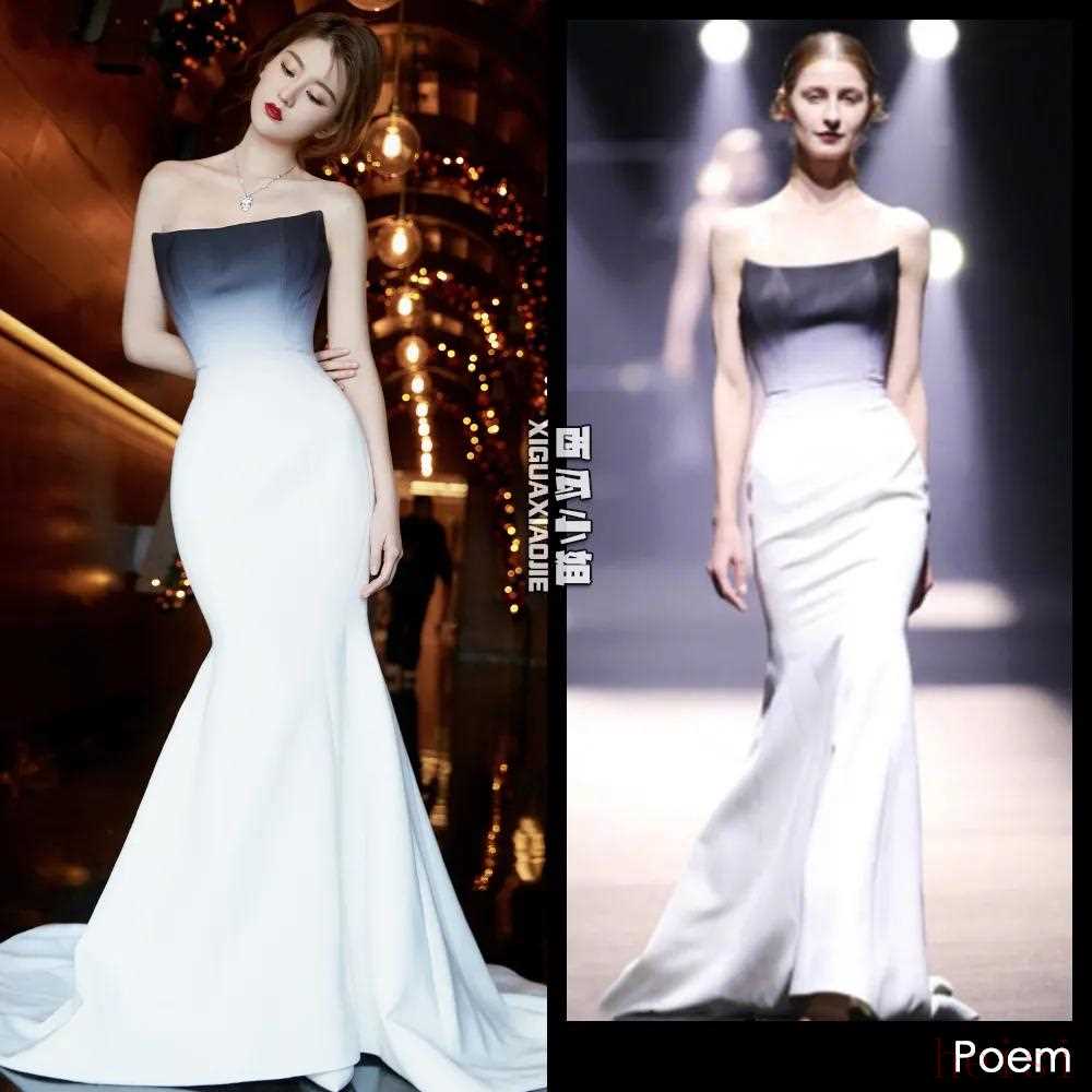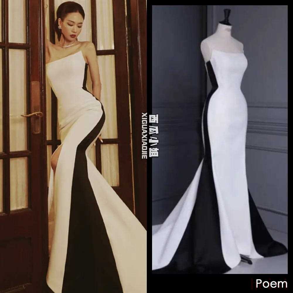 王霏霏這一身黑白禮服也來自Poem,兩側的黑色線條完美凸顯腰線,大氣性感。