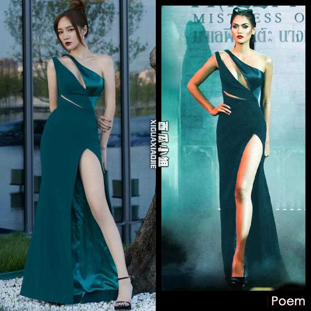 大概是好姐妹之間互相通氣,孟佳也穿過好幾次Poem,選的也都是提升比例的高開叉長裙。