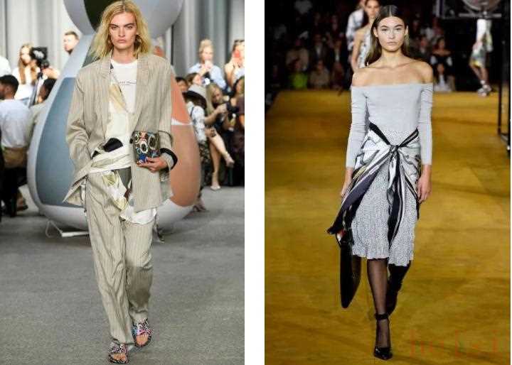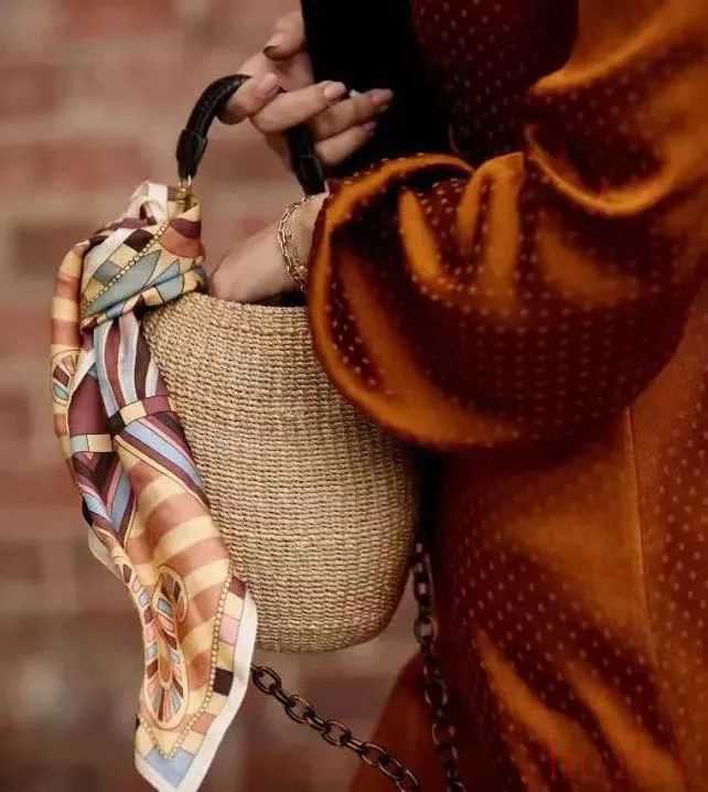 比如把方巾繞成一只迷你手袋,拎在手里,便是街上最吸睛的配飾;風(fēng)衣或西裝的紐扣間別上一截,剛硬的剪裁里立刻滲進(jìn)柔媚,瀟灑與浪漫撞了個(gè)滿懷。