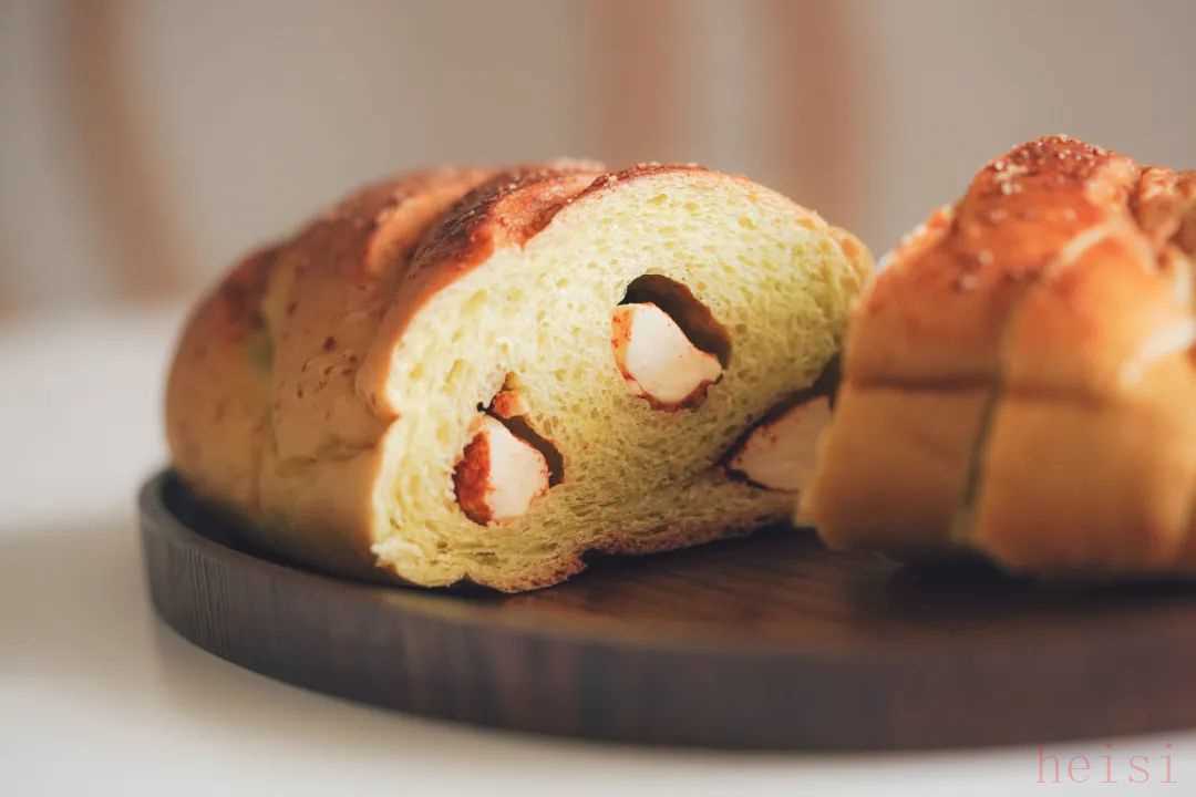 面包體里揉進(jìn)了菠菜汁,是可愛(ài)的嫩綠,但吃起來(lái)不會(huì)有菠菜的青澀。