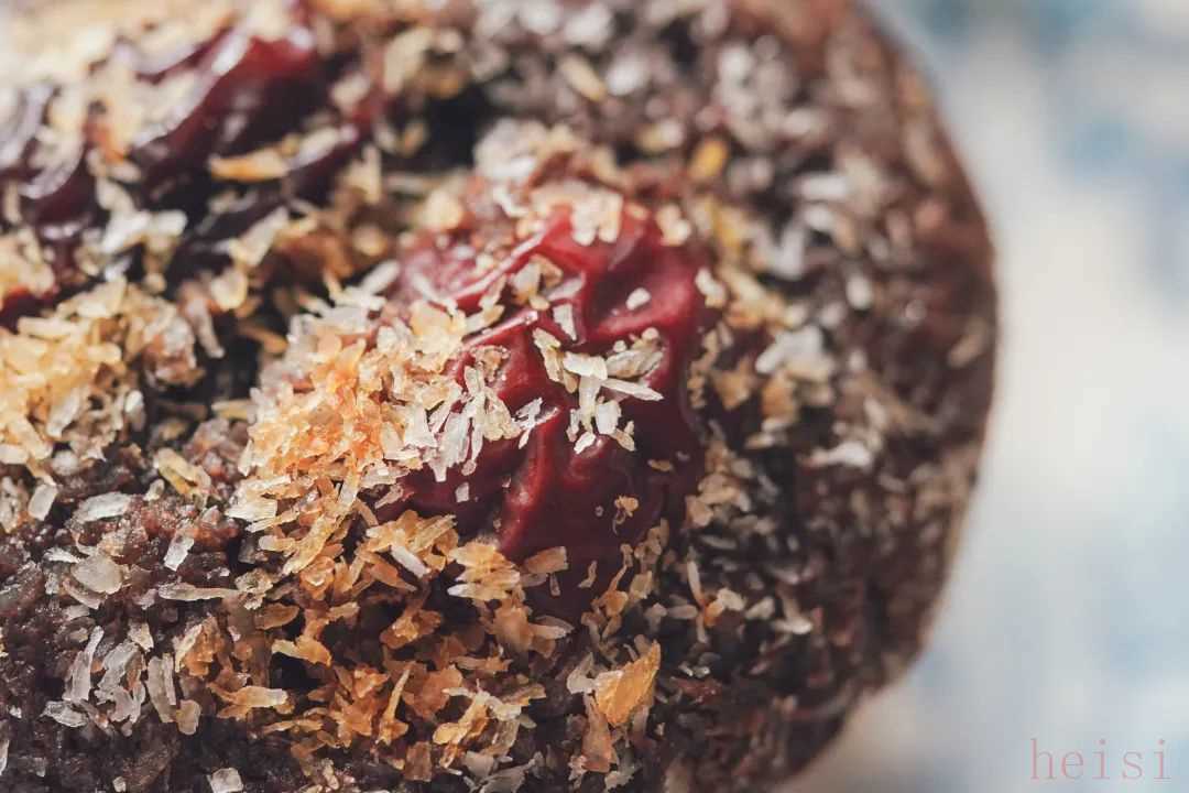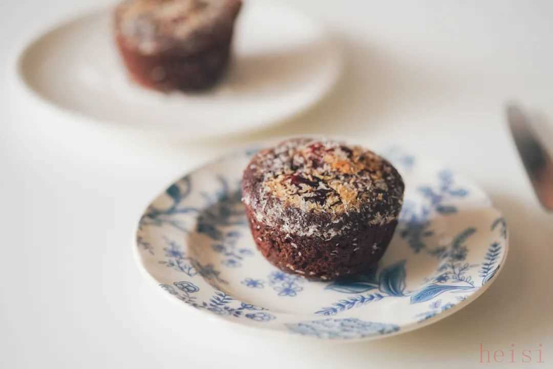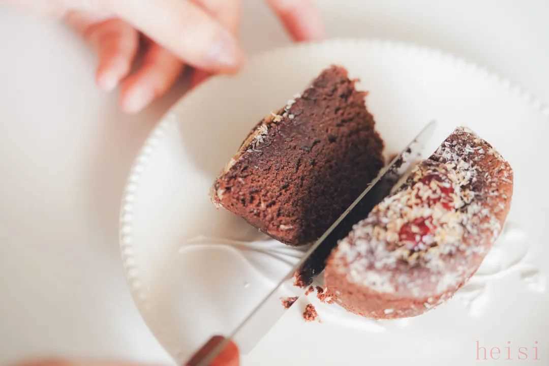 頂上是椰蓉和在朗姆酒里浸泡了一周的紅棗,柔軟而帶著酒香,和巧克力超搭,又上頭又養(yǎng)生!
