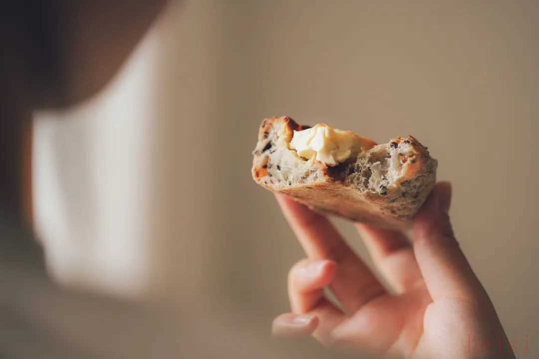 有韌勁的面包里夾著黑芝麻,配上芝士越嚼越香...