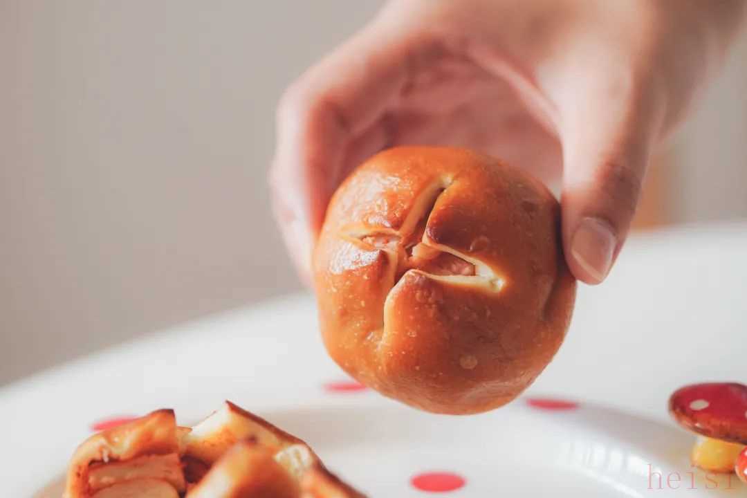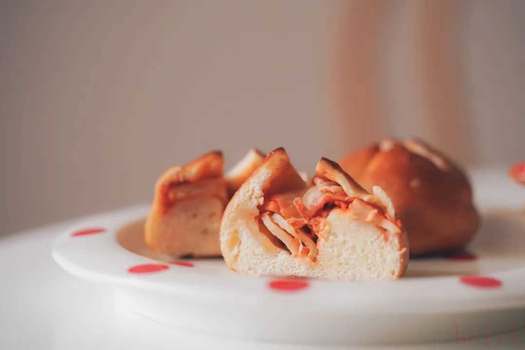這枚泡菜魚(yú)餅堿水就很少見(jiàn)!普通面包更推薦線下購(gòu)買(mǎi),更新鮮更好吃。